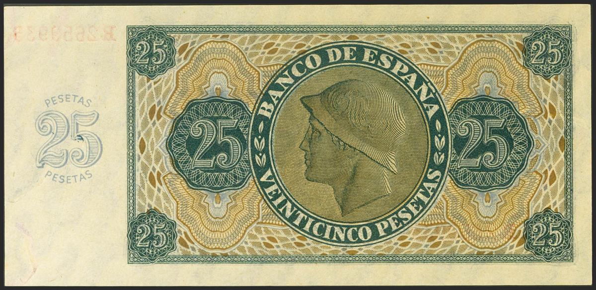 25 Pesetas. 21 de Noviembre de 1936. Serie R. (Edifil 2021: 419a). Conserva todo su apresto original. SC-.
