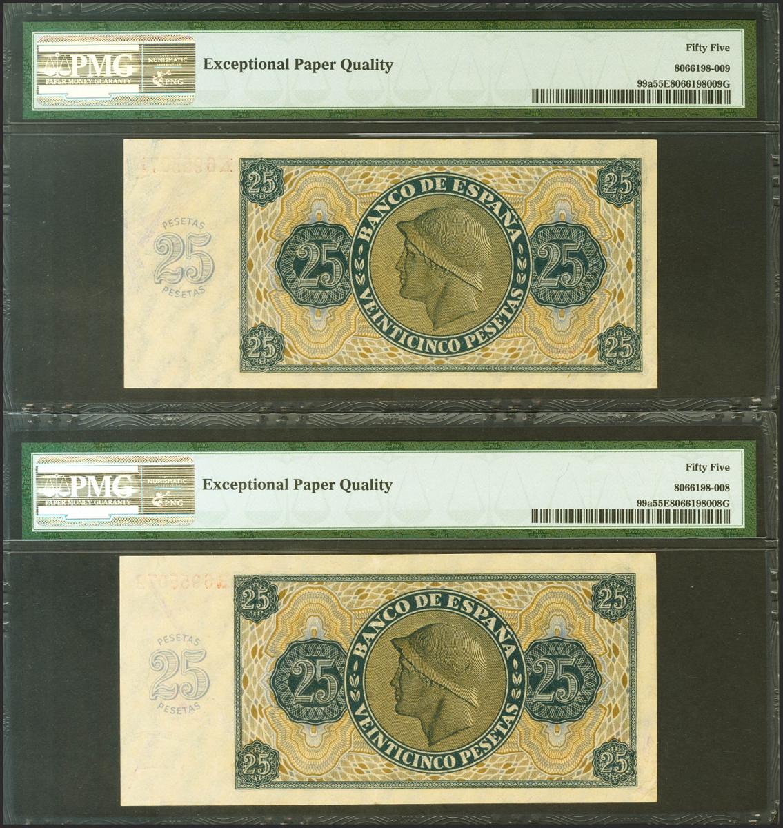 25 Pesetas. 21 de Noviembre de 1936. Pareja correlativa. Serie R. (Edifil 2021: 419a, Pick: 99a). Apresto original. EBC++. Encapsulados PMG55EPQ, ambos.