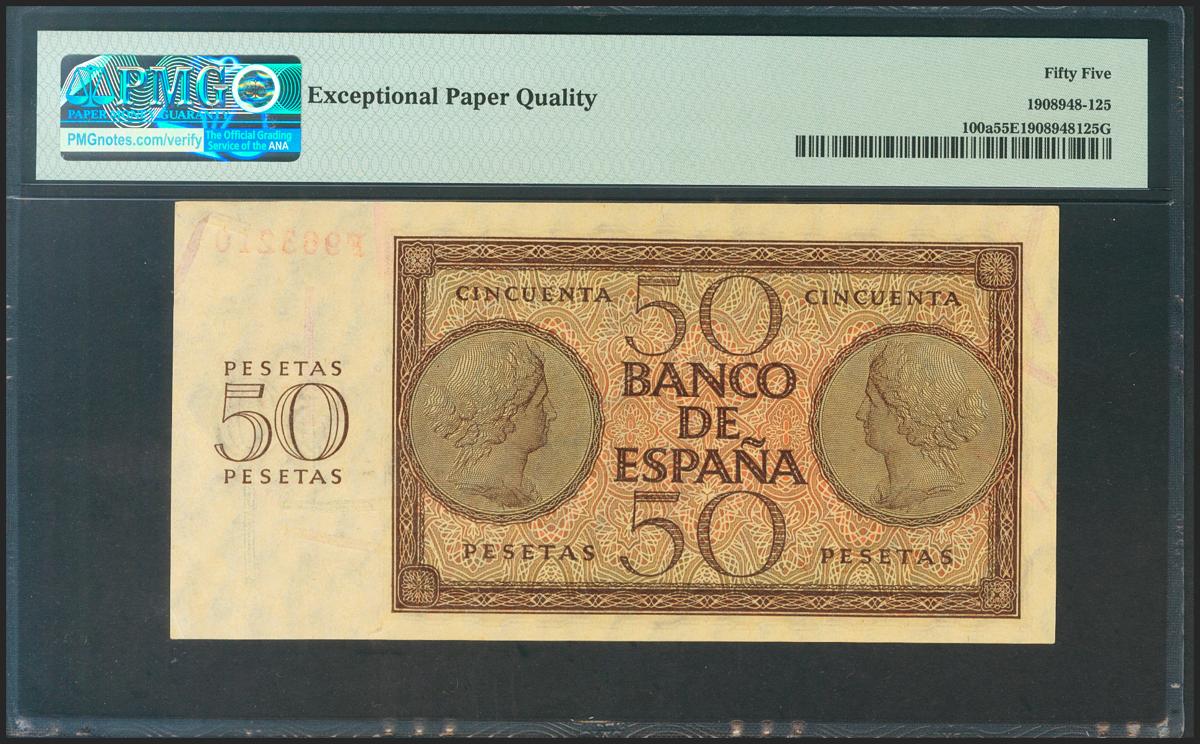 50 Pesetas. 21 de Noviembre de 1936. Serie F. (Edifil 2021: 420a, Pick: 100a). Apresto original. EBC+. Encapsulado PMG55EPQ.
