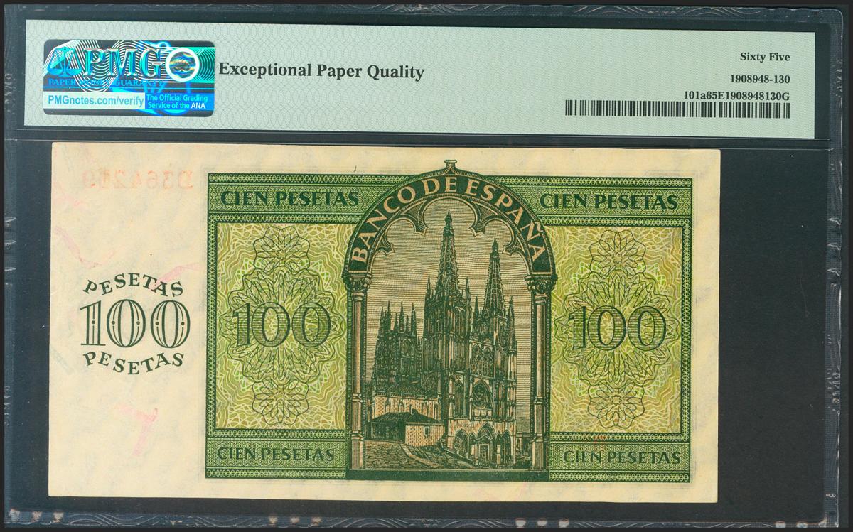 100 Pesetas. 21 de Noviembre de 1936. Serie D. (Edifil 2021: 421a, Pick: 101a). Inusual en esta calidad, apresto original. SC. Encapsulado PMG65EPQ.