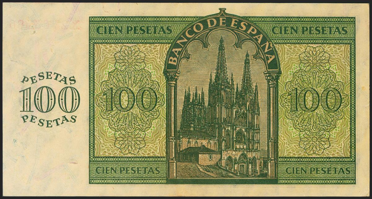 100 Pesetas. 21 de Noviembre de 1936. Serie X, última serie emitida. (Edifil 2021: 421a). Conserva parte del apresto original. EBC.