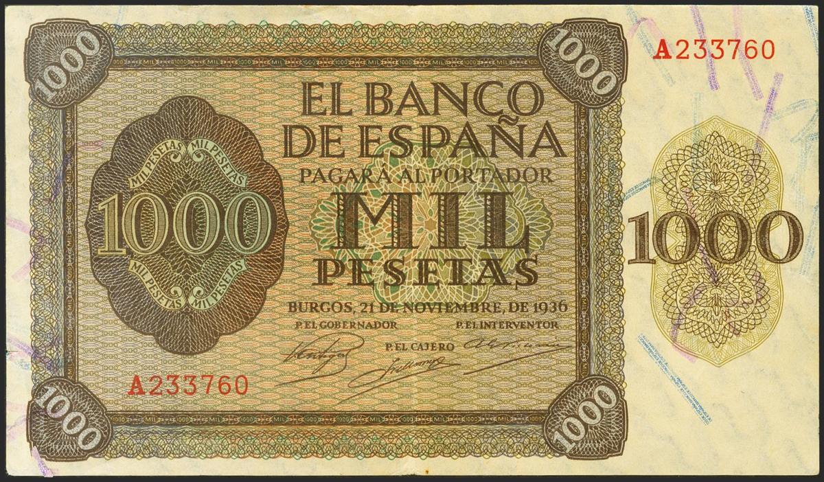 1000 Pesetas. 21 de Noviembre de 1936. Serie A. (Edifil 2021: 423). MBC.