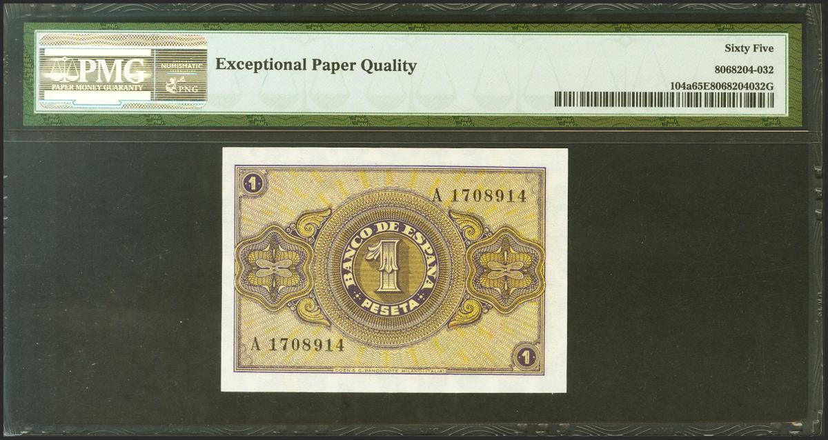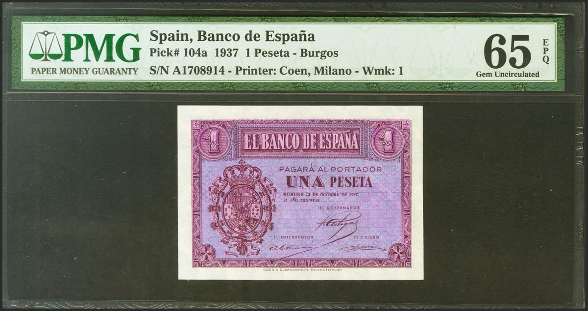 1 Peseta. 12 de Octubre de 1937. Serie A. (Edifil 2021: 425, Pick: 104a). Apresto original. Encapsulado PMG65EPQ.