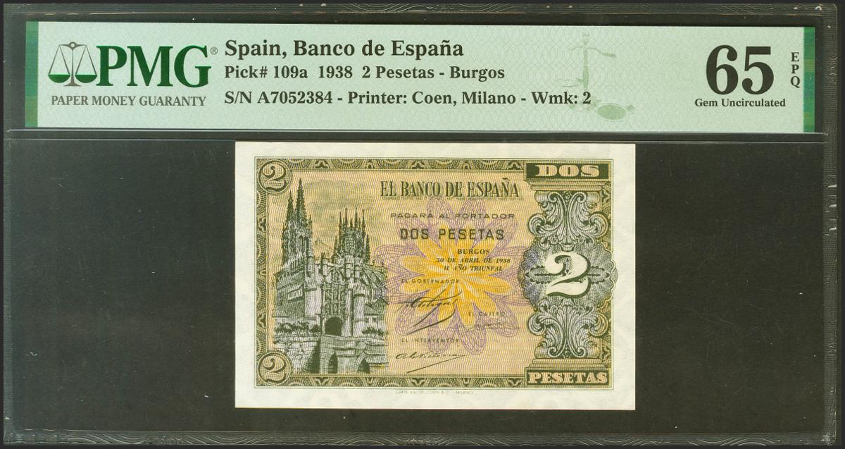 2 Pesetas. 30 de Abril de 1938. Serie A. (Edifil 2021: 429, Pick: 109a). Inusual en esta excepcional calidad, apresto original. SC. Encapsulado PMG65EPQ.