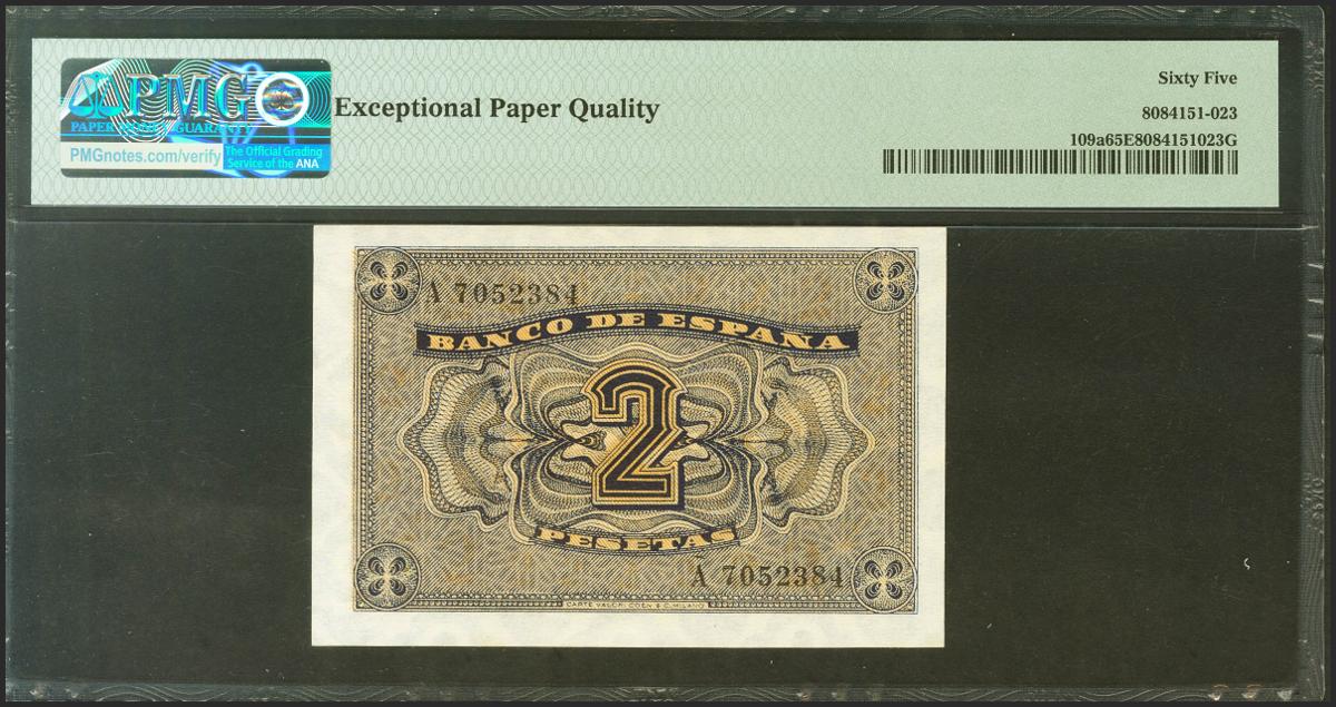 2 Pesetas. 30 de Abril de 1938. Serie A. (Edifil 2021: 429, Pick: 109a). Inusual en esta excepcional calidad, apresto original. SC. Encapsulado PMG65EPQ.