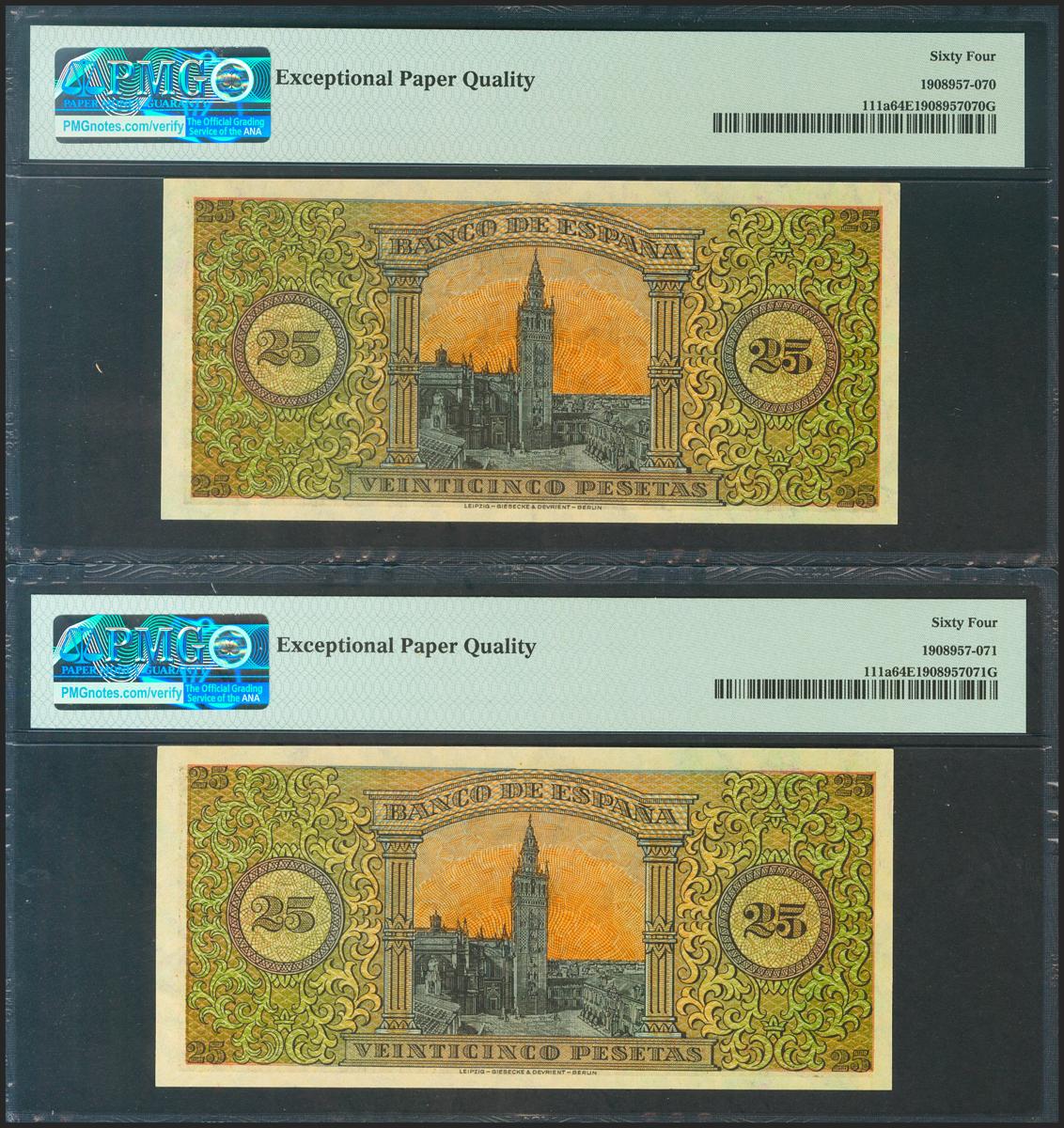 25 Pesetas. 20 de Mayo de 1938. Pareja correlativa. Serie D. (Edifil 2021: 430a, Pick: 111a). Inusual en esta calidad, apresto original. SC. Encapsulado PMG64EPQ, ambos.