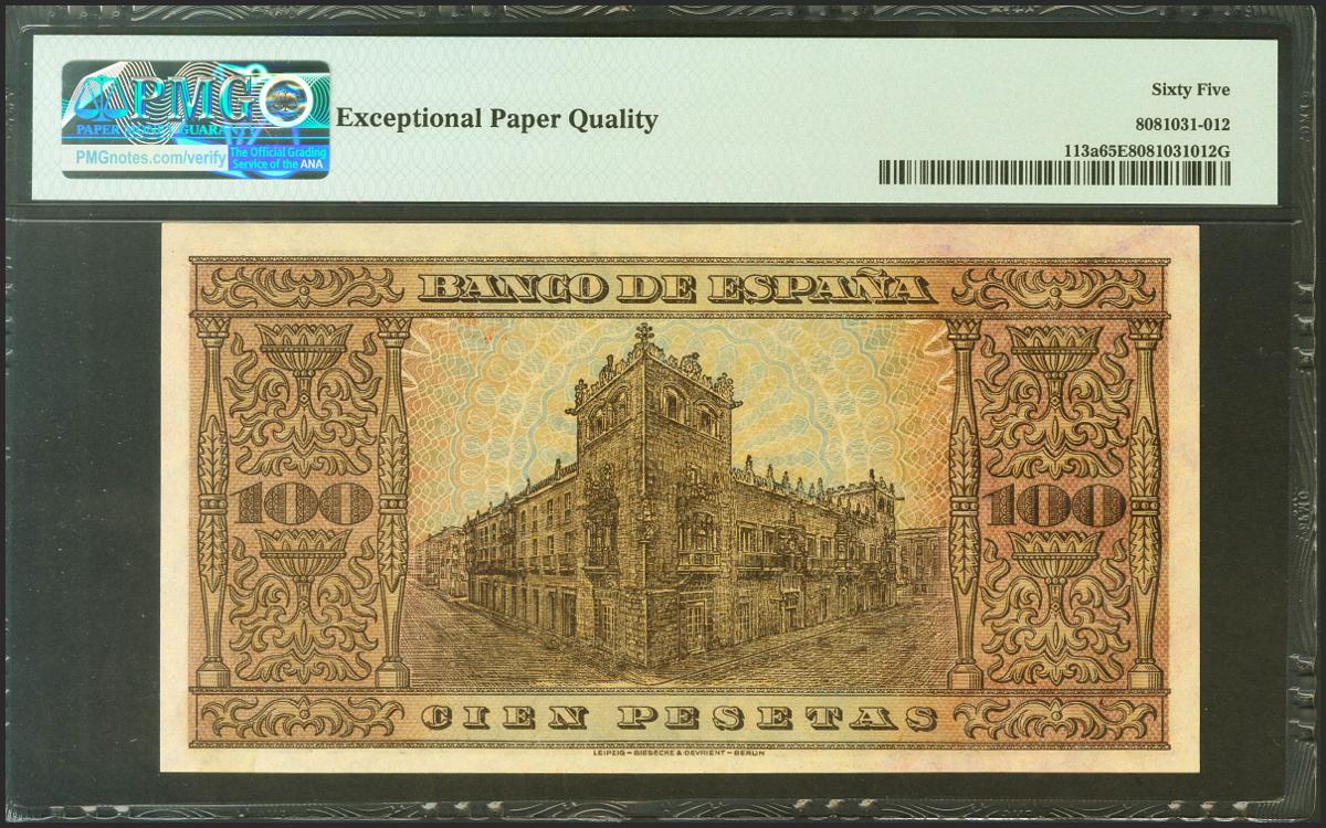 100 Pesetas. 20 de Mayo de 1938. Serie A. (Edifil 2021: 432, Pick: 113a). Apresto original. Encapsulado PMG65EPQ.