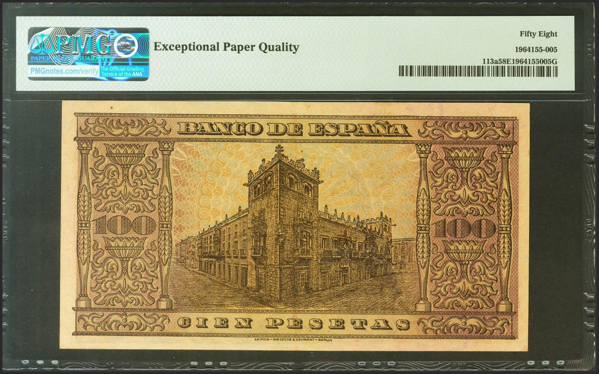 100 Pesetas. 20 de Mayo de 1938. Serie C. (Edifil 2021: 432a, Pick: 113a). Apresto original. EBC+++. Encapsulado PMG58EPQ.