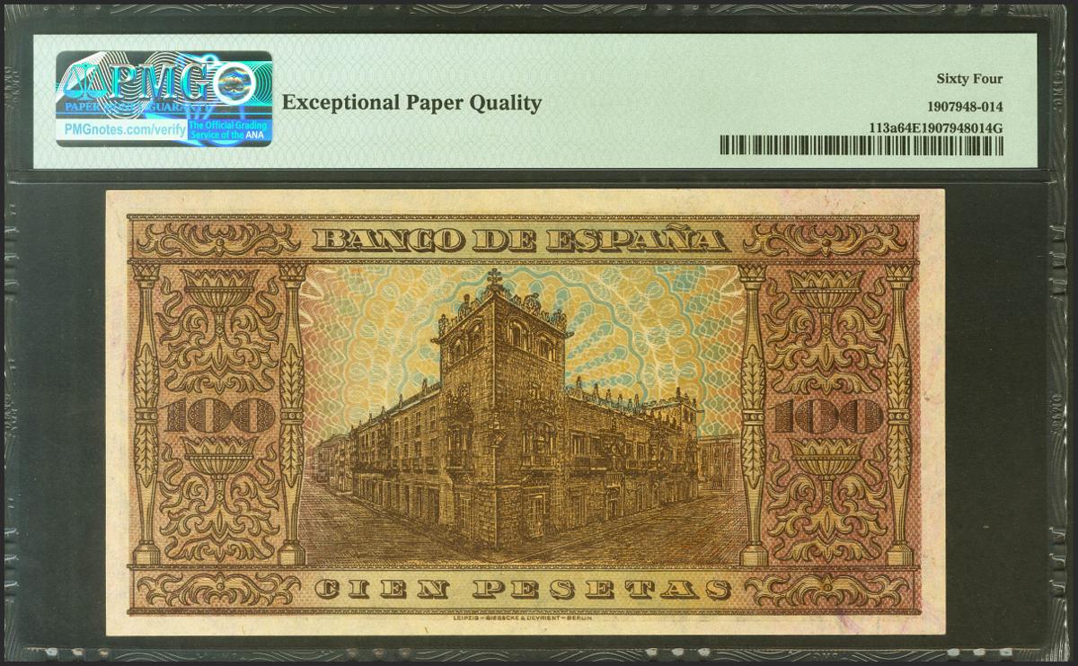 100 Pesetas. 20 de Mayo de 1938. Serie F. (Edifil 2021: 432a, Pick: 113a). Apresto original. SC. Encapsulado PMG64EPQ.