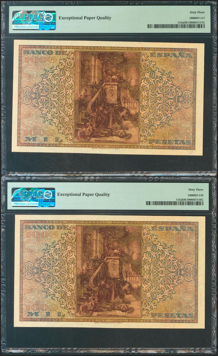 1000 Pesetas. 20 de Mayo de 1938. Pareja correlativa. Serie A. (Edifil 2021: 434, Pick: 115a). Rarísima pareja, especialmente en esta calidad, apresto original. SC. Encapsulado PMG63EPQ, ambos.