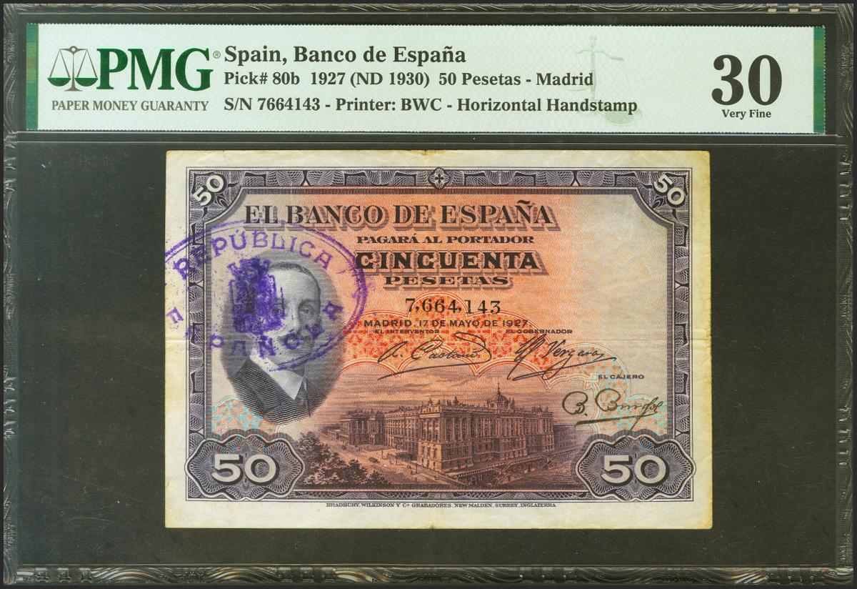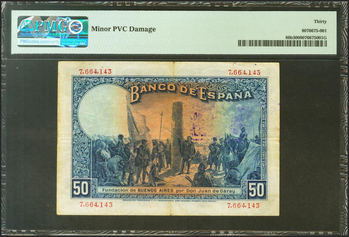 50 Pesetas. 17 de Julio de 1927. Sin serie y sello de caucho REPUBLICA / ESPAÑOLA. (Edifil 2021: 332, Pick: 80b). MBC. Encapsulado PMG30.