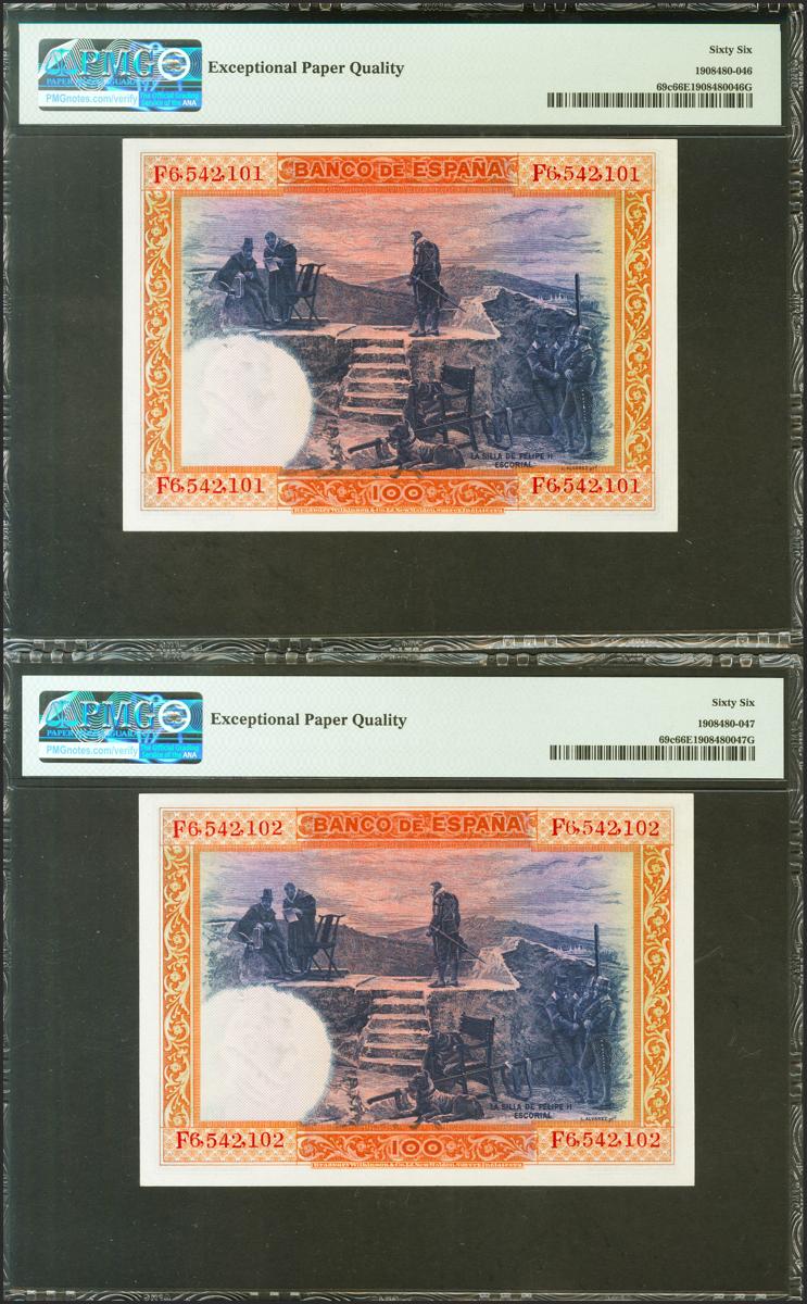 100 Pesetas. 1 de Julio de 1925. Pareja correlativa. Serie F, última serie emitida. (Edifil 2021: 350, Pick: 69c). Inusual, apresto original. SC. Encapsulados PMG66EPQ, ambos.