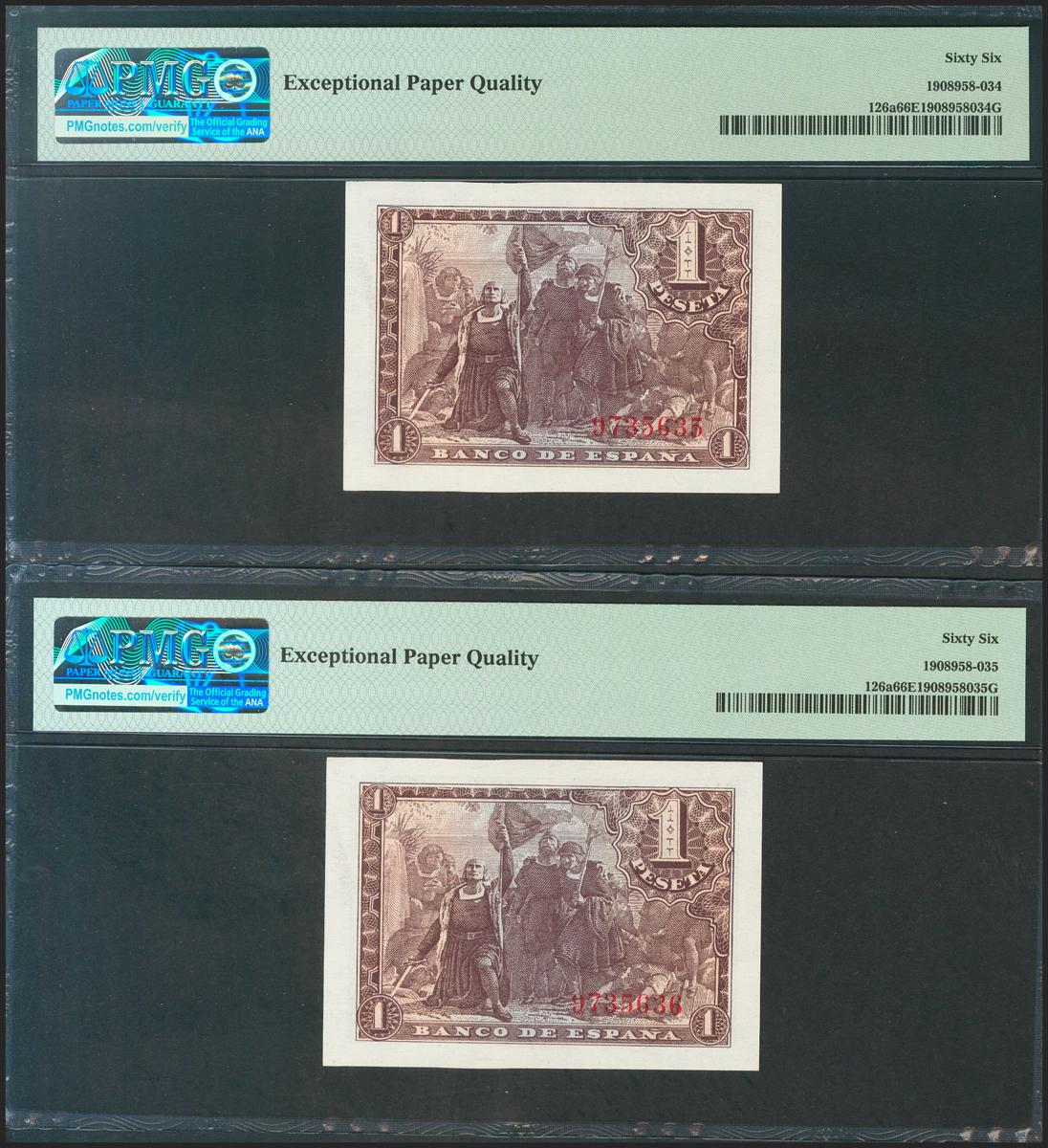 1 Pesetas. 21 de Mayo de 1943. Pareja correlativa. Sin serie. (Edifil 2021: 447, Pick: 126a). Rara en esta calidad, apresto original. SC. Encapsulado PMG66EPQ, ambos.