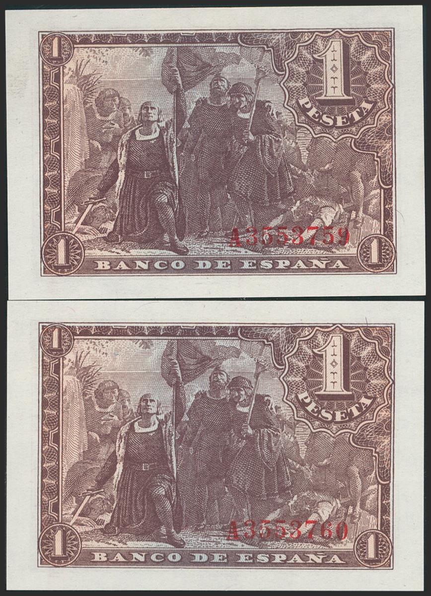 1 Peseta. 21 de Mayo de 1943. Pareja correlativa. Serie A. (Edifil 2021: 447a). Apresto original. SC-.