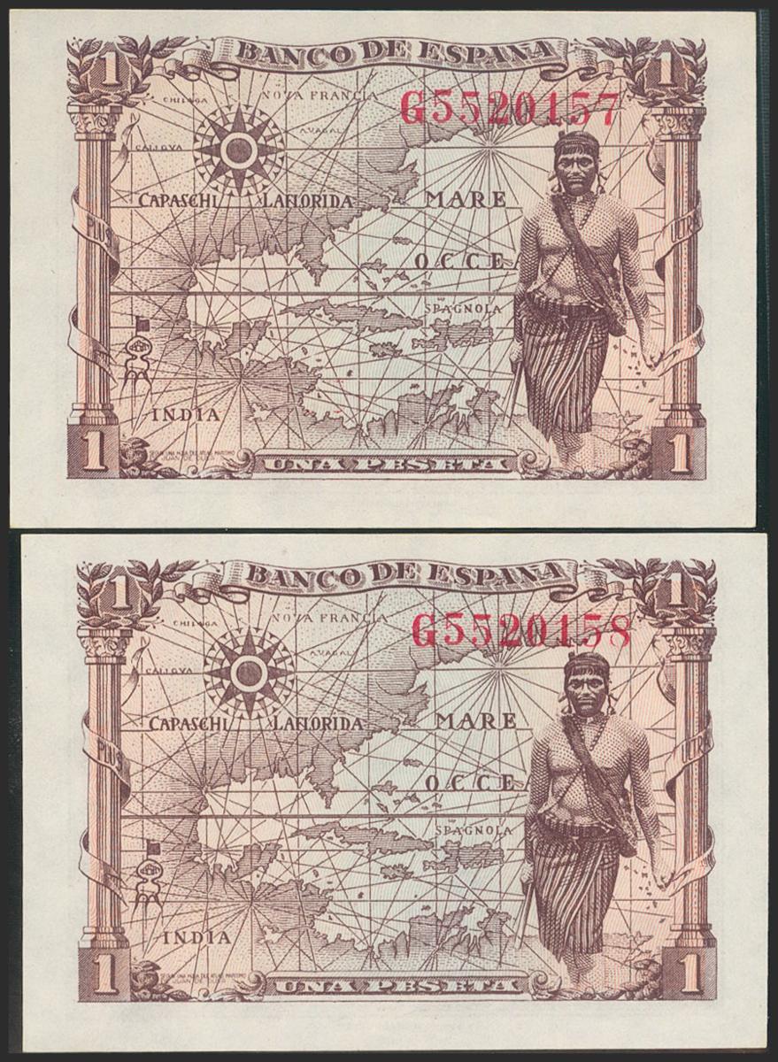 1 Peseta. 15 de Junio de 1945. Pareja correlativa. Serie G. (Edifil 2021: 448a). Apresto original. SC/SC-.