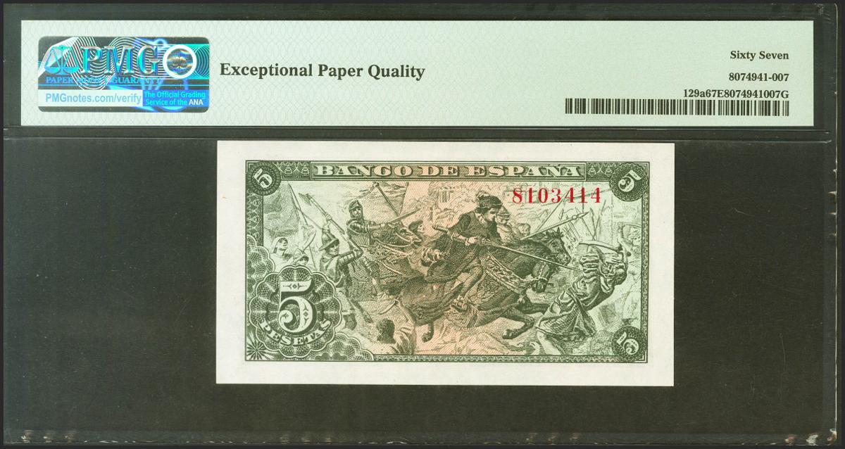 5 Pesetas. 15 de Junio de 1945. Sin serie. (Edifil 2021: 449, Pick: 129a). Inusual en esta excepcional calidad, apresto original. SC. Encapsulado PMG67EPQ.