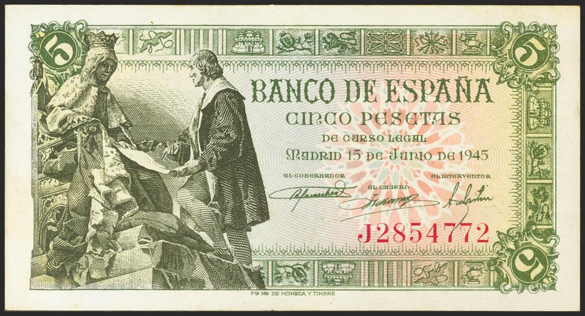5 Pesetas. 15 de Junio de 1945. Serie J. (Edifil 2021: 449a). Conserva parte de su apresto original. EBC+.