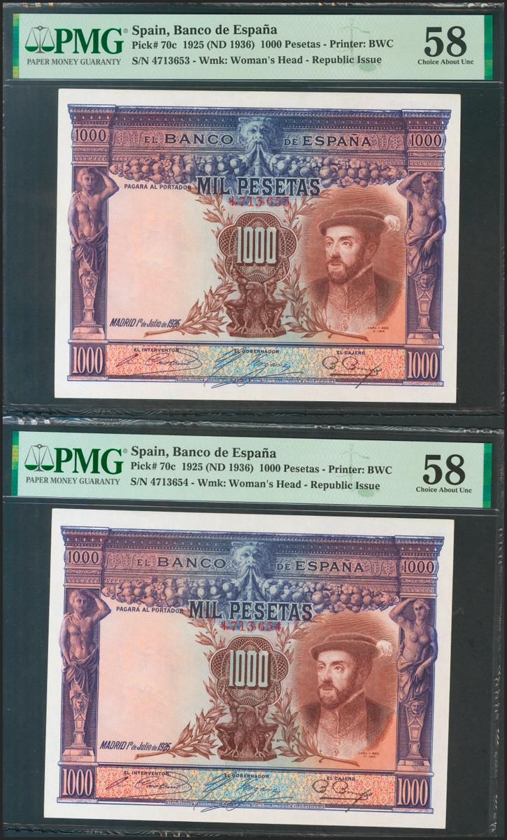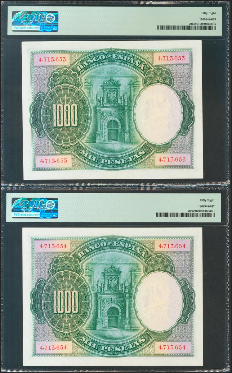 1000 Pesetas. 1 de Julio de 1925. Pareja correlativa. Sin serie y numeración posterior al 3646000. (Edifil 2021: 351, Pick: 70c). Inusual en esta calidad. EBC++. Encapsulado PMG58, ambos.
