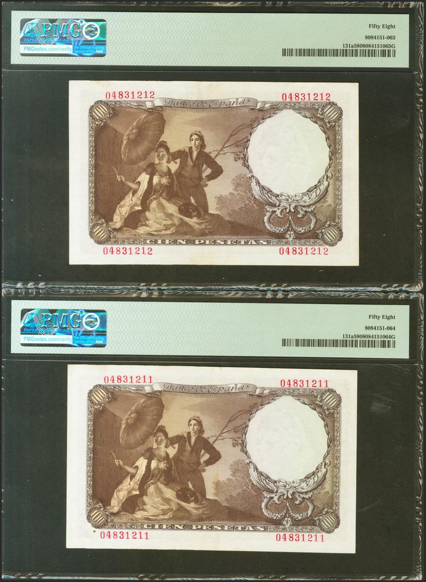 100 Pesetas. 19 de Febrero de 1946. Pareja correlativa. Sin serie. (Edifil 2021: 451, Pick: 131a). EBC++. Encapsulados PMG58, ambos.