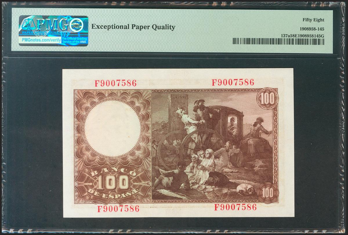 100 Pesetas. 2 de Mayo de 1948. Serie F. (Edifil 2021: 456a, Pick: 137a). Apresto original. EBC+++. Encapsulado PMG58EPQ.