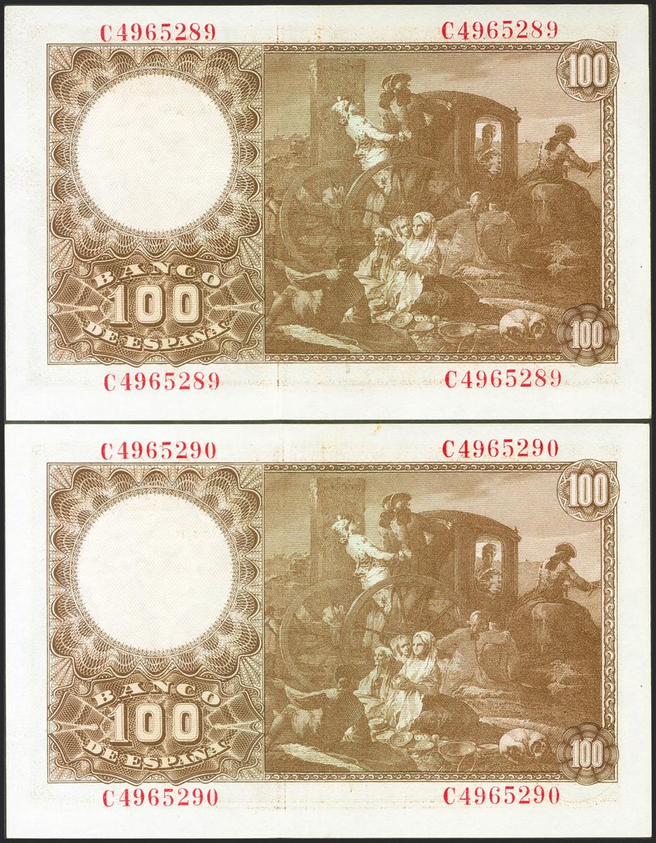 100 Pesetas. 2 de Mayo de 1948. Pareja correlativa. Serie C. (Edifil 2021: 456a). Conserva gran parte del apresto original. EBC+.