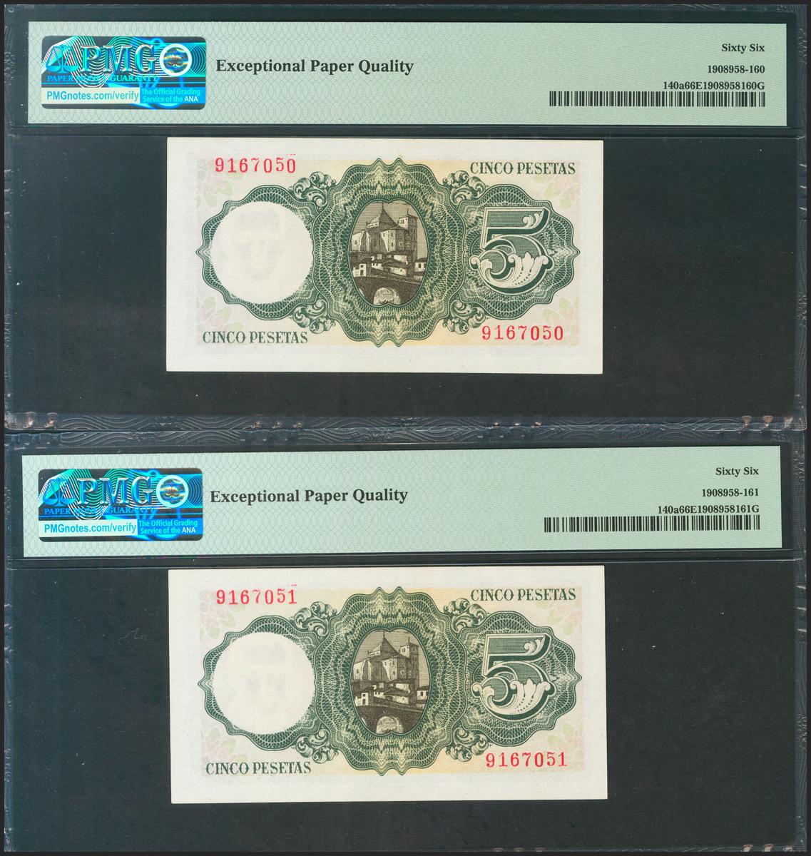 5 Pesetas. 16 de Agosto de 1951. Pareja correlativa. Sin serie. (Edifil 2021: 459, Pick: 140a). Rara en esta calidad, apresto original. SC. Encapsulado PMG66EPQ, ambos.