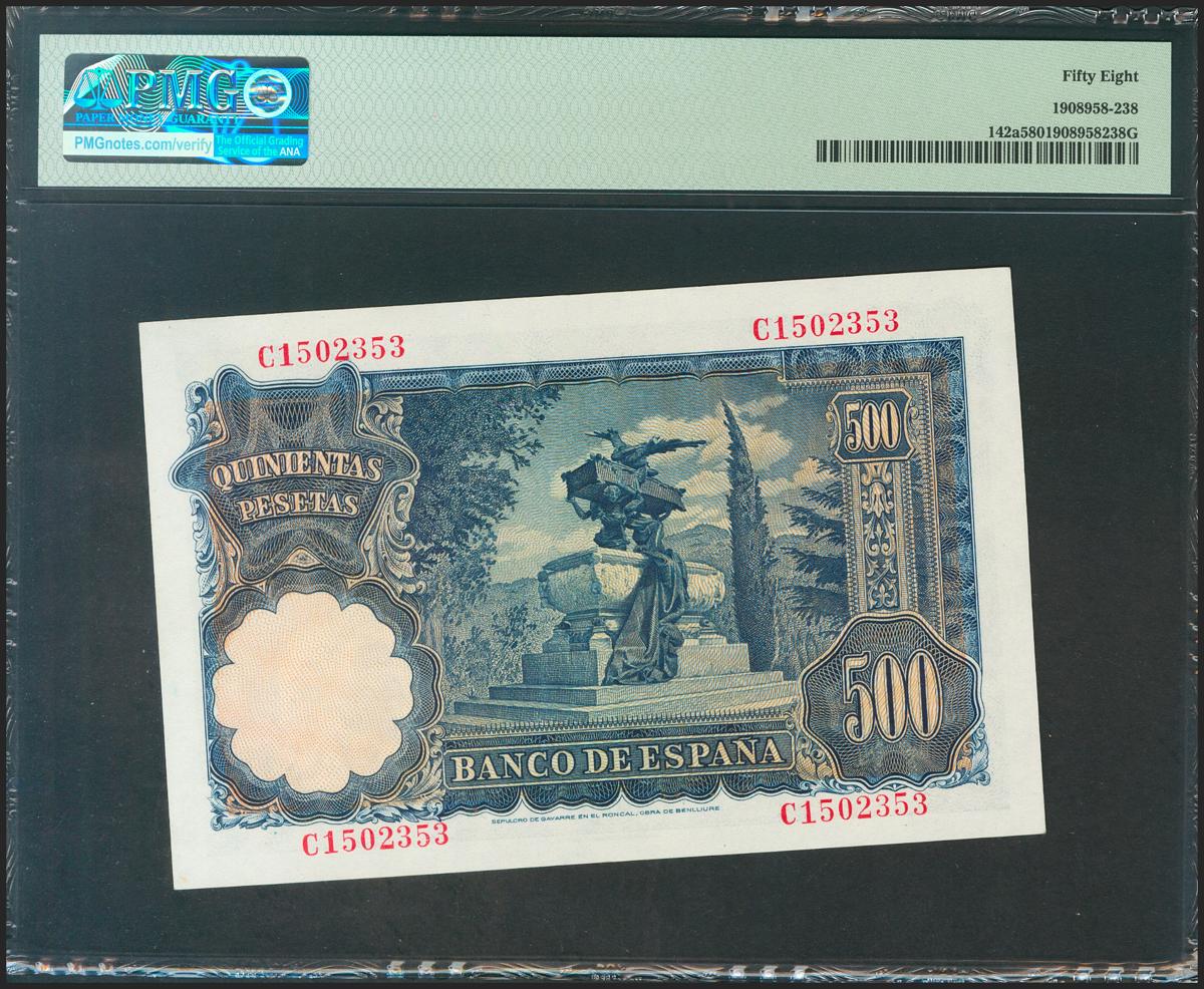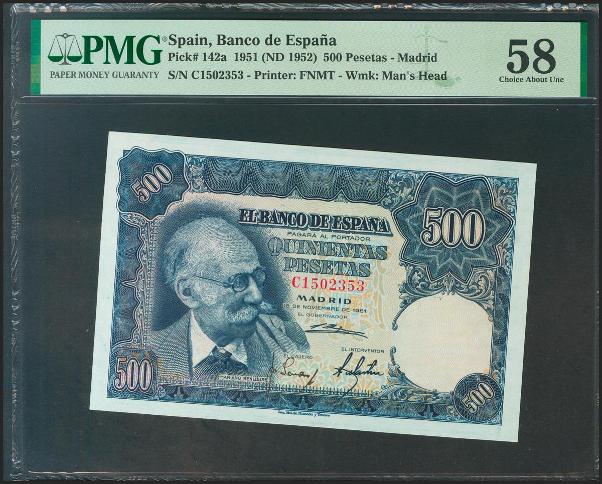 500 Pesetas. 15 de Noviembre de 1951. Serie C, última serie emitida. (Edifil 2021: 460a, Pick: 142a). Inusual en esta calidad. EBC++. Encapsulado PMG58.
