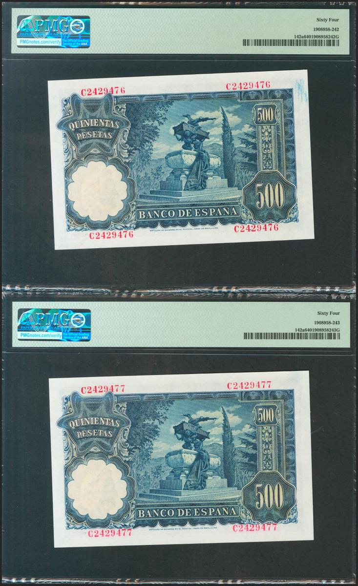 500 Pesetas. 15 de Noviembre de 1951. Pareja correlativa. Serie C, última serie emitida. (Edifil 2021: 460a, Pick: 142a). Inusual en esta calidad. SC. Encapsulado PMG64, ambos.
