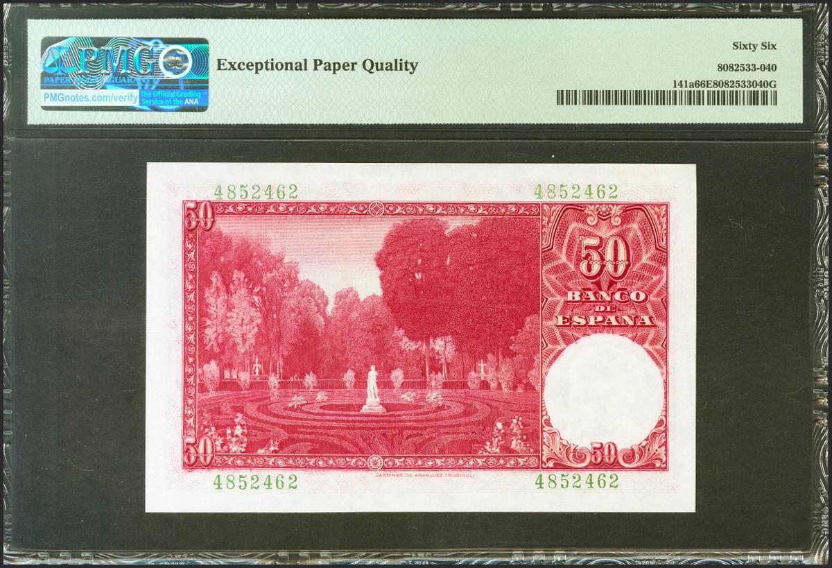50 Pesetas. 31 de Diciembre de 1951. Sin serie. (Edifil 2021: 462, Pick: 141). Apresto original. SC. Encapsulado PMG66EPQ.