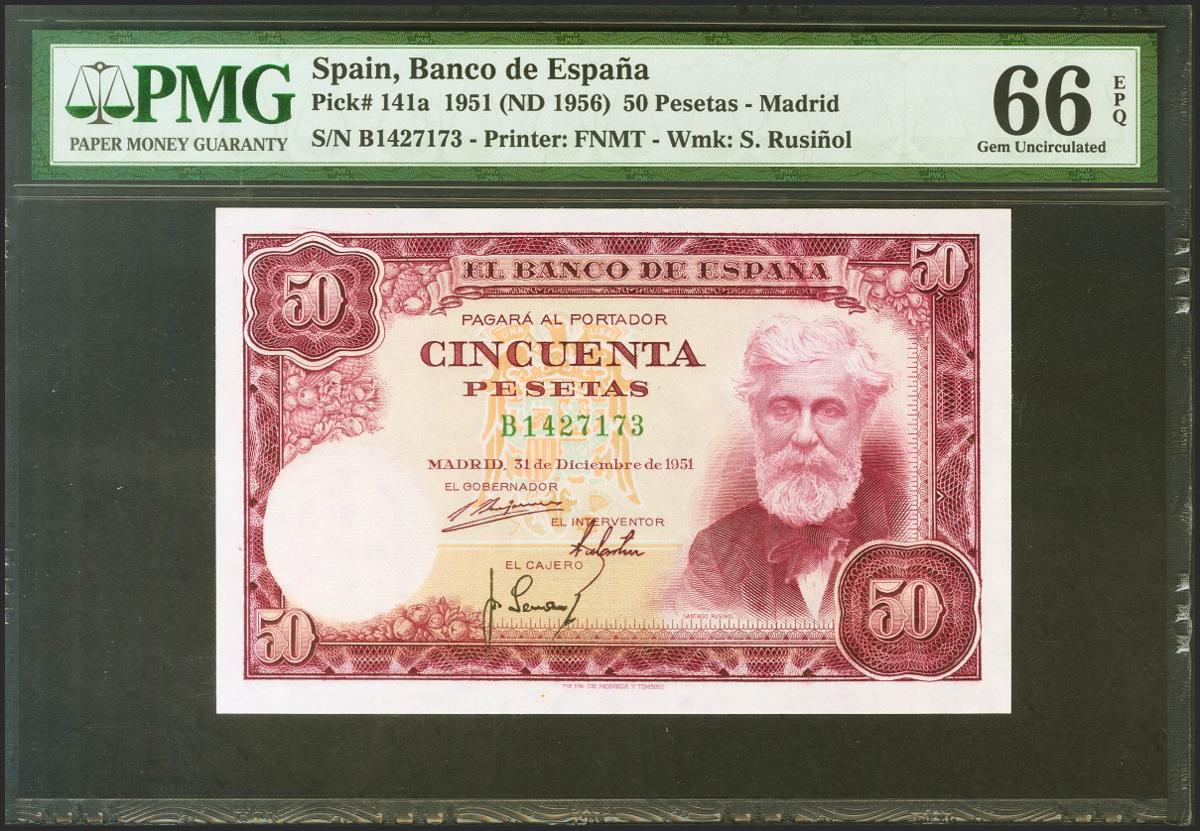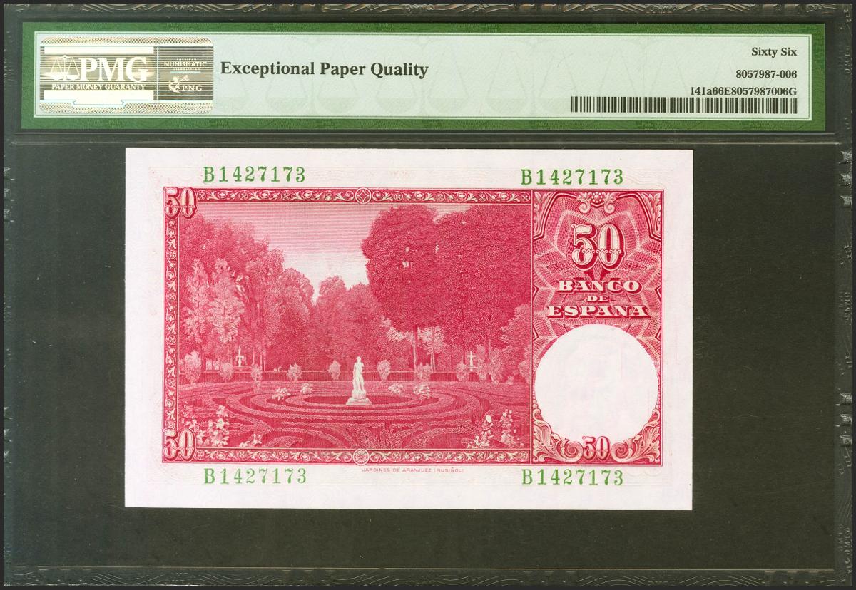 50 Pesetas. 31 de Diciembre de 1951. Serie B. (Edifil 2021: 462a, Pick: 141a). Apresto original. SC. Encapsulado PMG66EPQ.