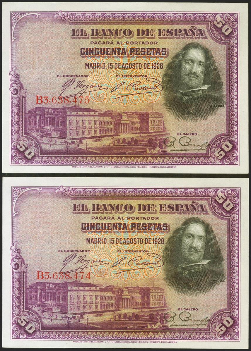 50 Pesetas. 15 de Agosto de 1928. Pareja correlativa. Inusual serie B. (Edifil 2021: 354). Apresto original. SC.