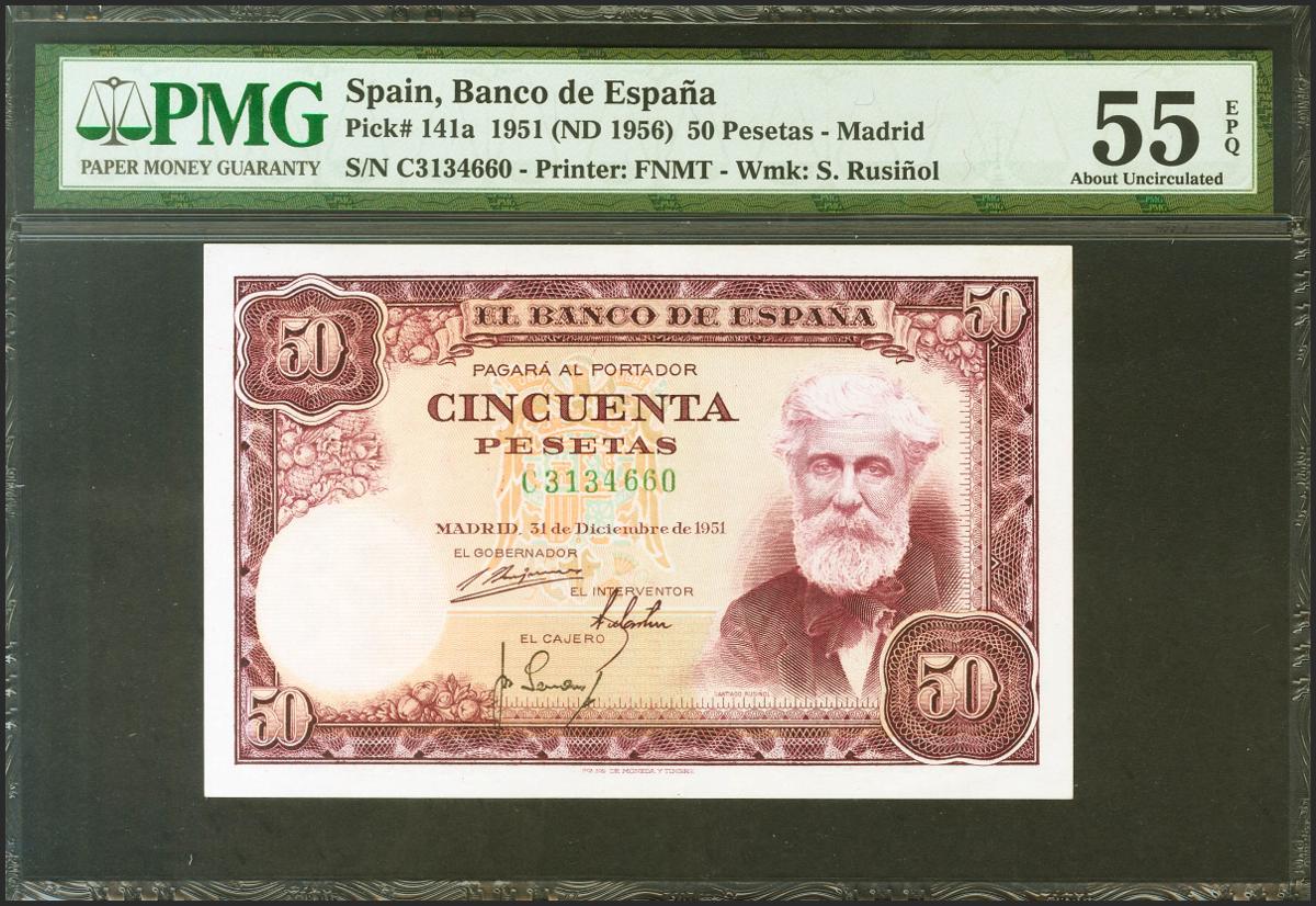 50 Pesetas. 31 de Diciembre de 1951. Serie C. (Edifil 2021: 462a, Pick: 141a). Apresto original. EBC+. Encapsulado PMG55EPQ.