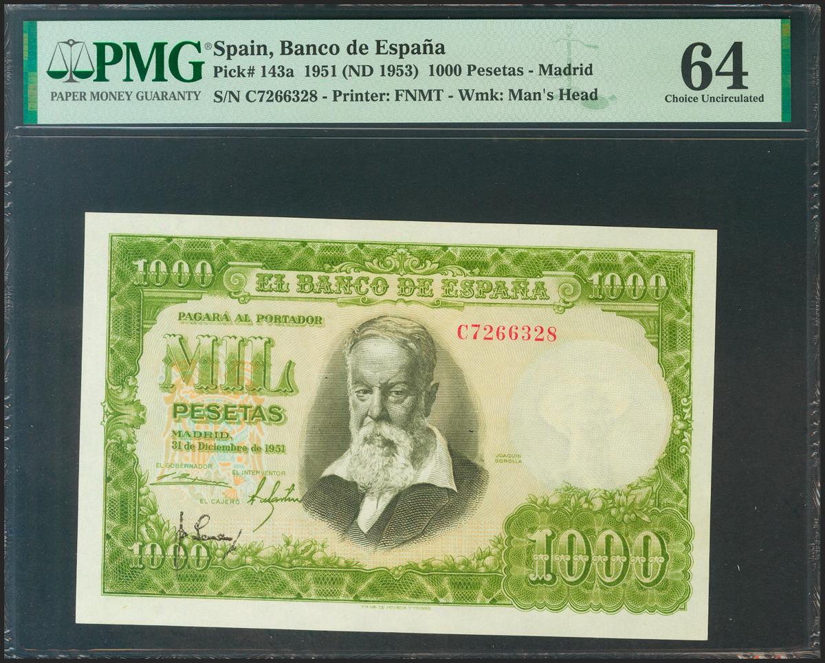 1000 Pesetas. 31 de Diciembre de 1951. Serie C, última serie emitida. (Edifil 2021: 463a, Pick: 143a). Inusual en esta calidad. SC. Encapsulado PMG64.