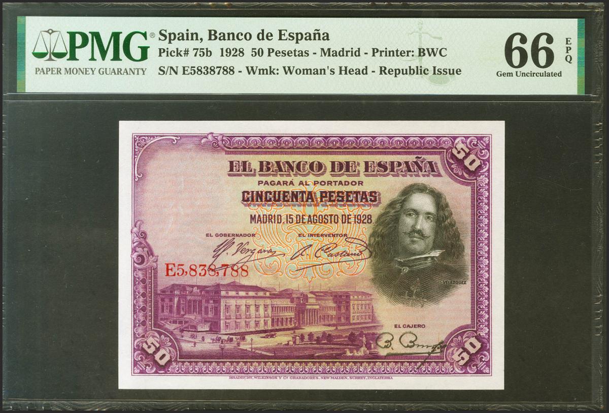 50 Pesetas. 15 de Agosto de 1928. Serie E. (Edifil 2021: 354, Pick: 75b). Apresto original. SC. Encapsulado PMG66EPQ.