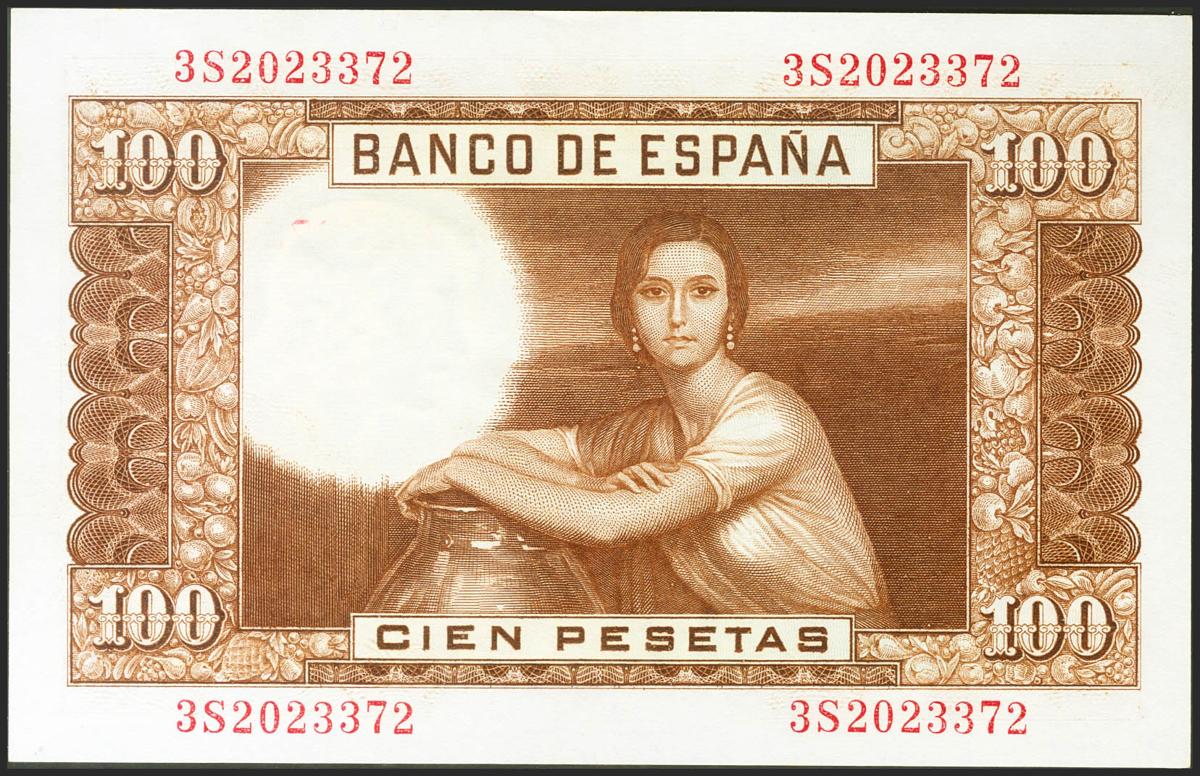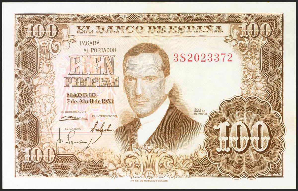 100 Pesetas. 7 de Abril de 1953. Serie 3S. (Edifil 2021: 464c). Conserva todo su apresto original. SC.