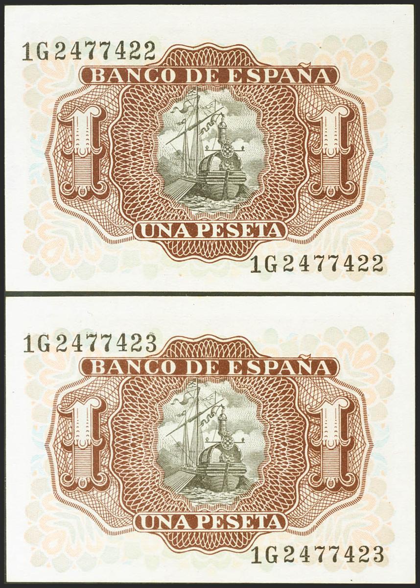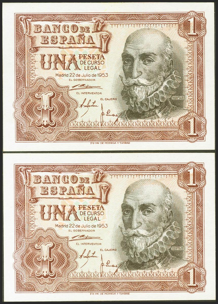 1 Peseta. 22 de Julio de 1953. Pareja correlativa. Serie 1G. (Edifil 2021: 465a). Apresto original. SC.