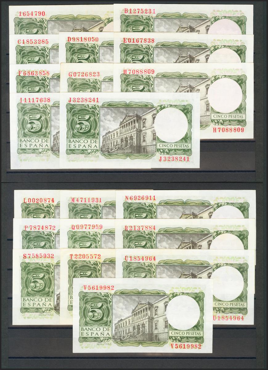 Precioso conjunto de 20 billetes de 5 Pesetas emitidos el 22 de Julio de 1954, incluyendo todas las letras de la serie inicial, a excepción de la A, K y W, e incluyendo el sin serie (Sin serie EBC-, B EBC-, C EBC+, D EBC+ y con anotaciones a tinta, E EBC, F EBC, G EBC, H EBC, I EBC-, J EBC, L EBC+, M EBC, N EBC, P EBC, Q EBC, R EBC, S EBC, T EBC, U EBC, V EBC). (Edifil 2021: 466, 466a). Inusual conjunto.
