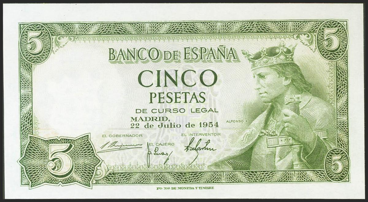 5 Pesetas. 22 de Julio de 1954. Serie N. (Edifil 2021: 466a). Conserva todo el apresto original. SC.