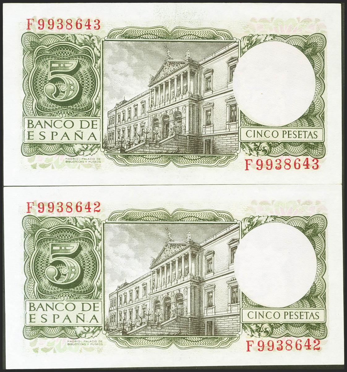 5 Pesetas. 22 de Julio de 1954. Pareja correlativa. Serie F. (Edifil 2021: 466a). Conserva gran parte de su apresto original. EBC+.