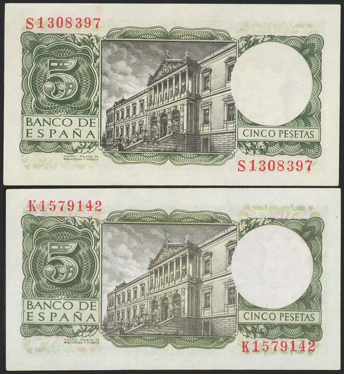 5 Pesetas. 22 de Julio de 1954. Pareja correlativa. Serie S. (Edifil 2021: 466a). Conserva parte del apresto original. EBC.