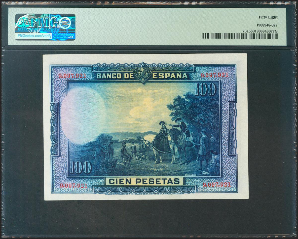100 Pesetas. 15 de Agosto de 1928. Sin serie. (Edifil 2021: 355, Pick: 76a). Inusual en esta calidad. EBC++. Encapsulado PMG58.