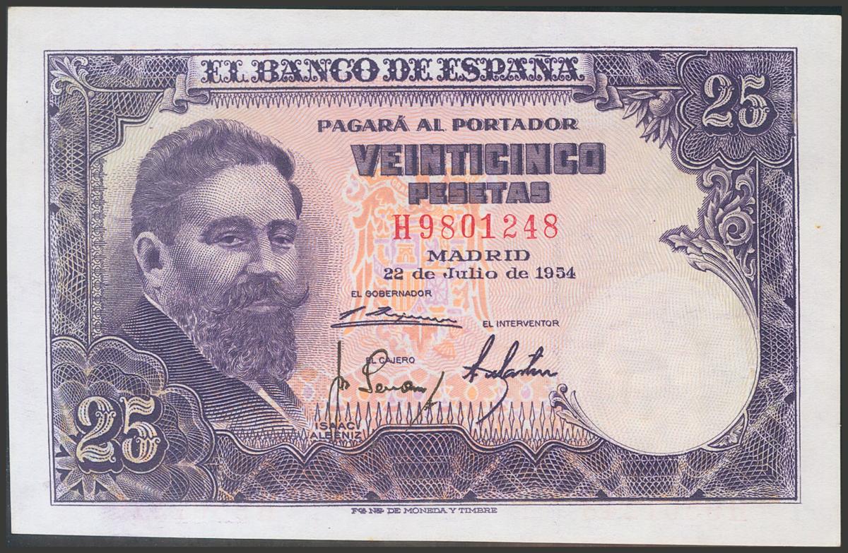 25 Pesetas. 22 de Julio de 1954. Serie H. (Edifil 2017: 467a). Apresto original. SC-.