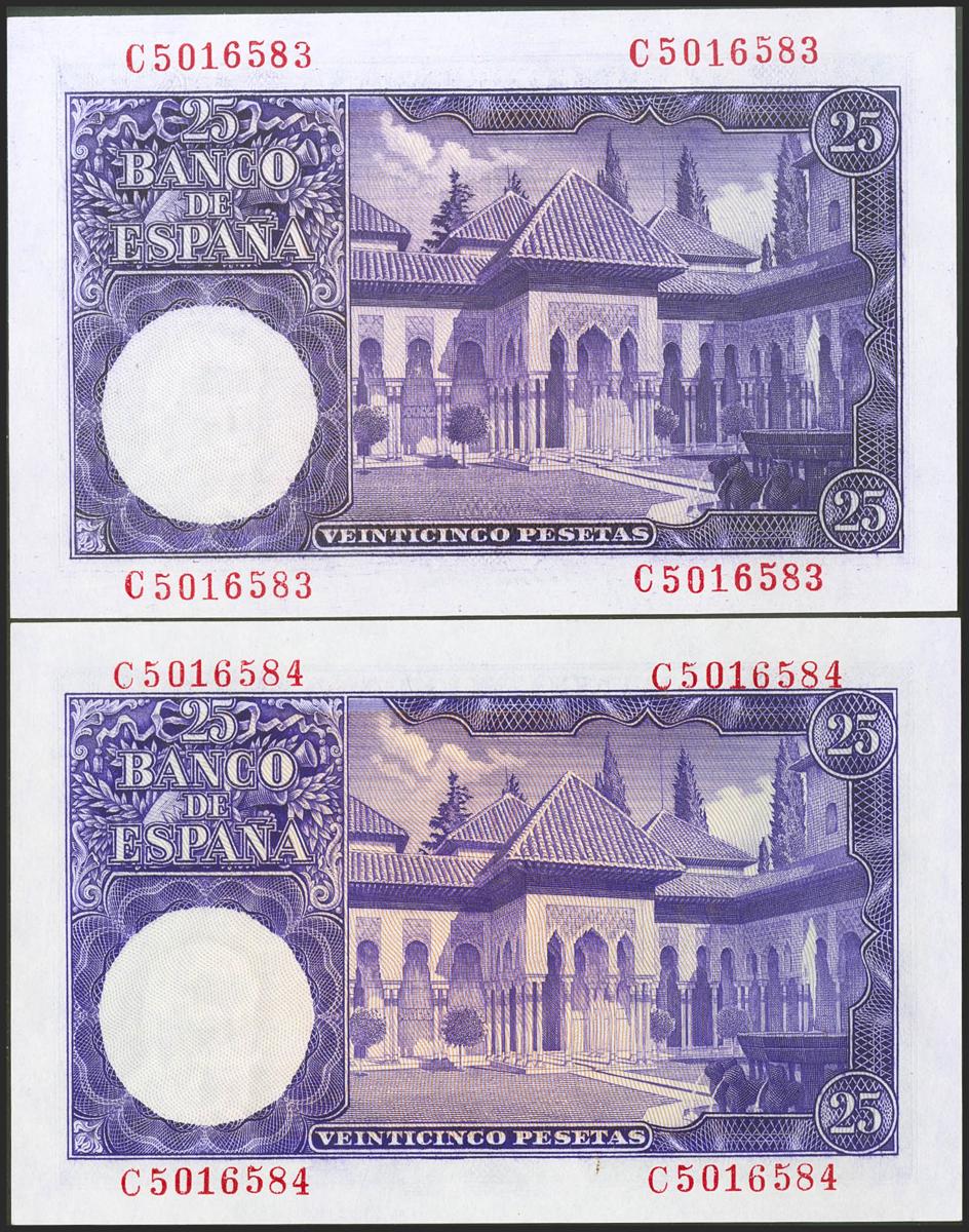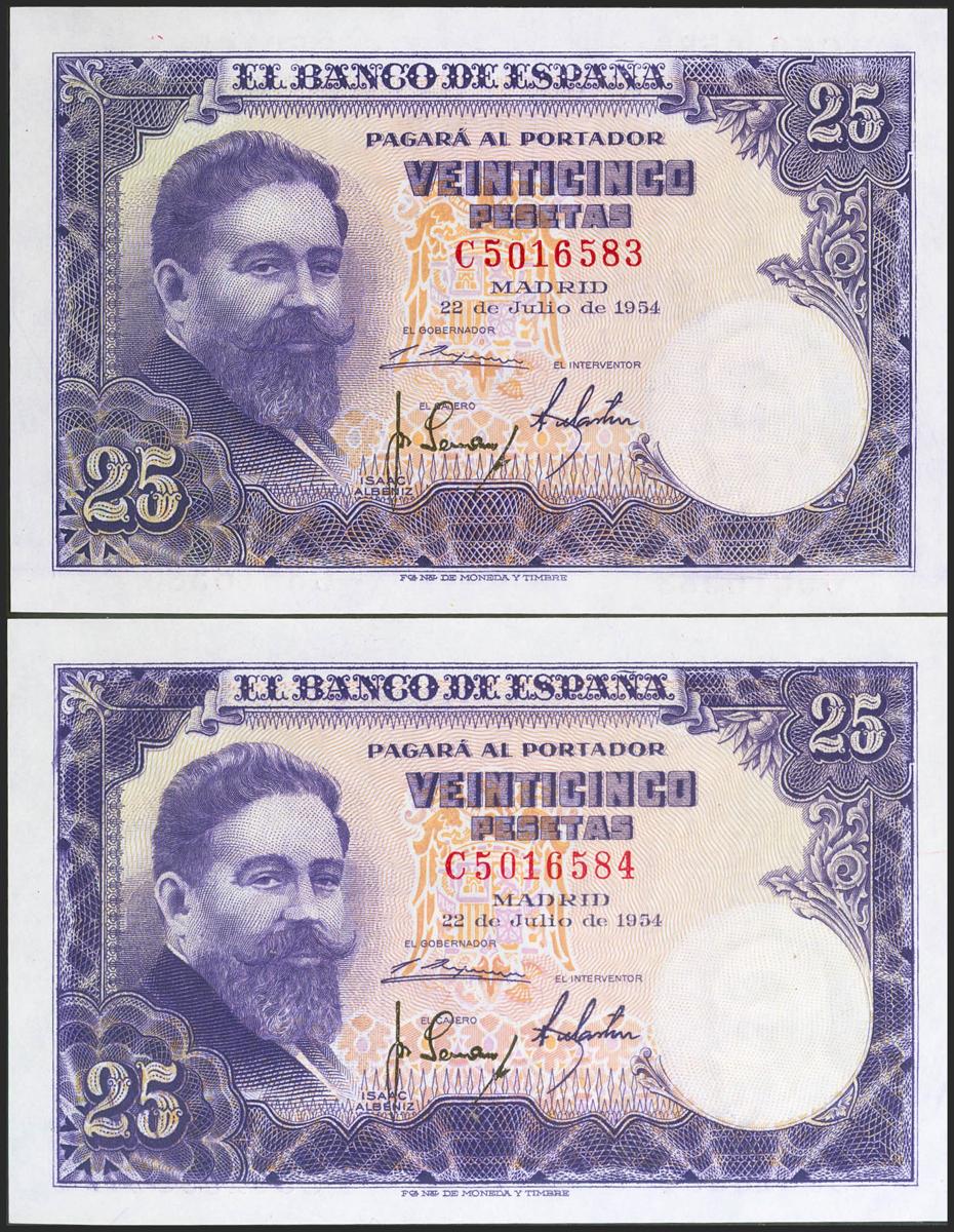 25 Pesetas. 22 de Julio de 1954. Pareja correlativa. Serie C. (Edifil 2021: 467a). Conserva todo su apresto original. SC.
