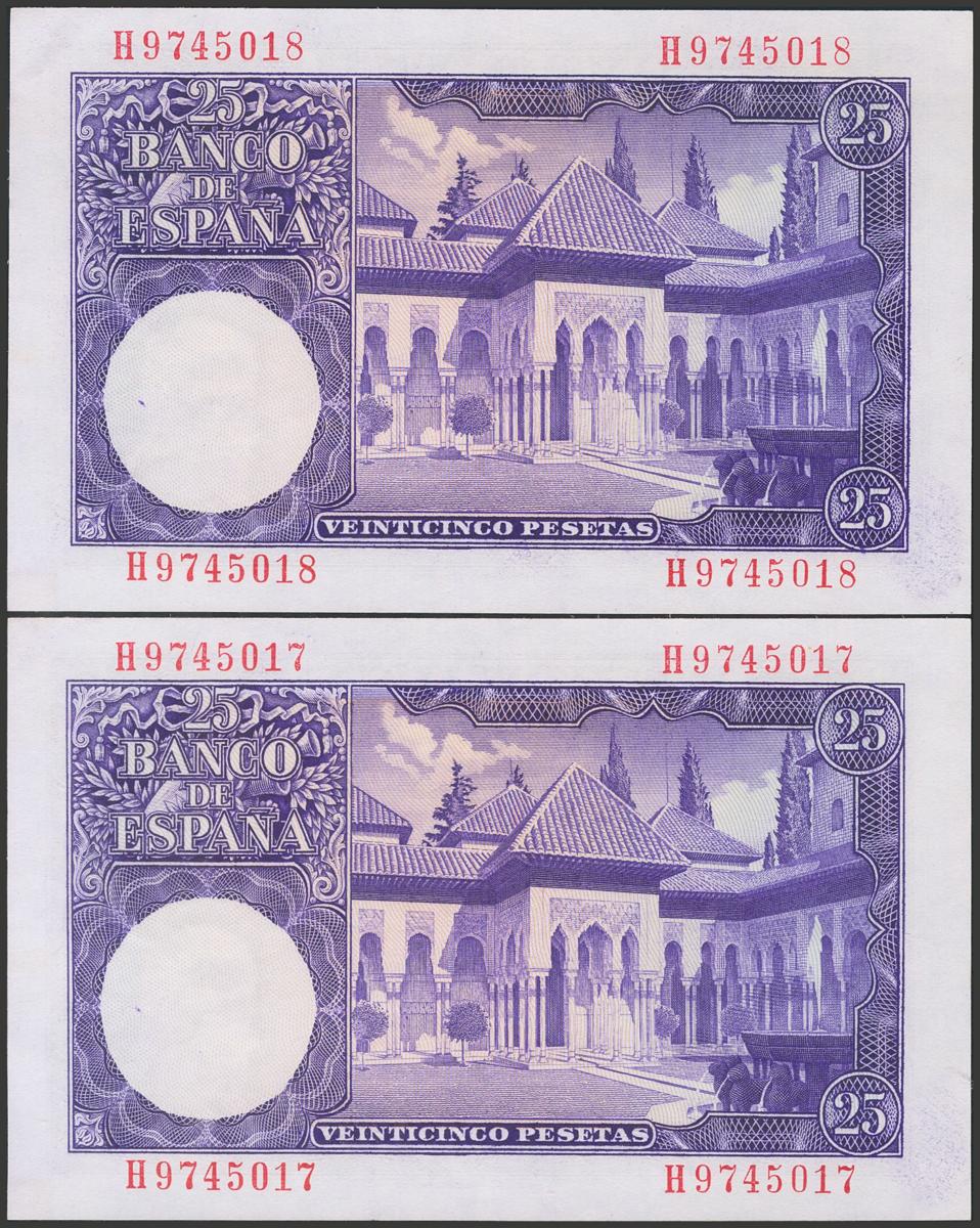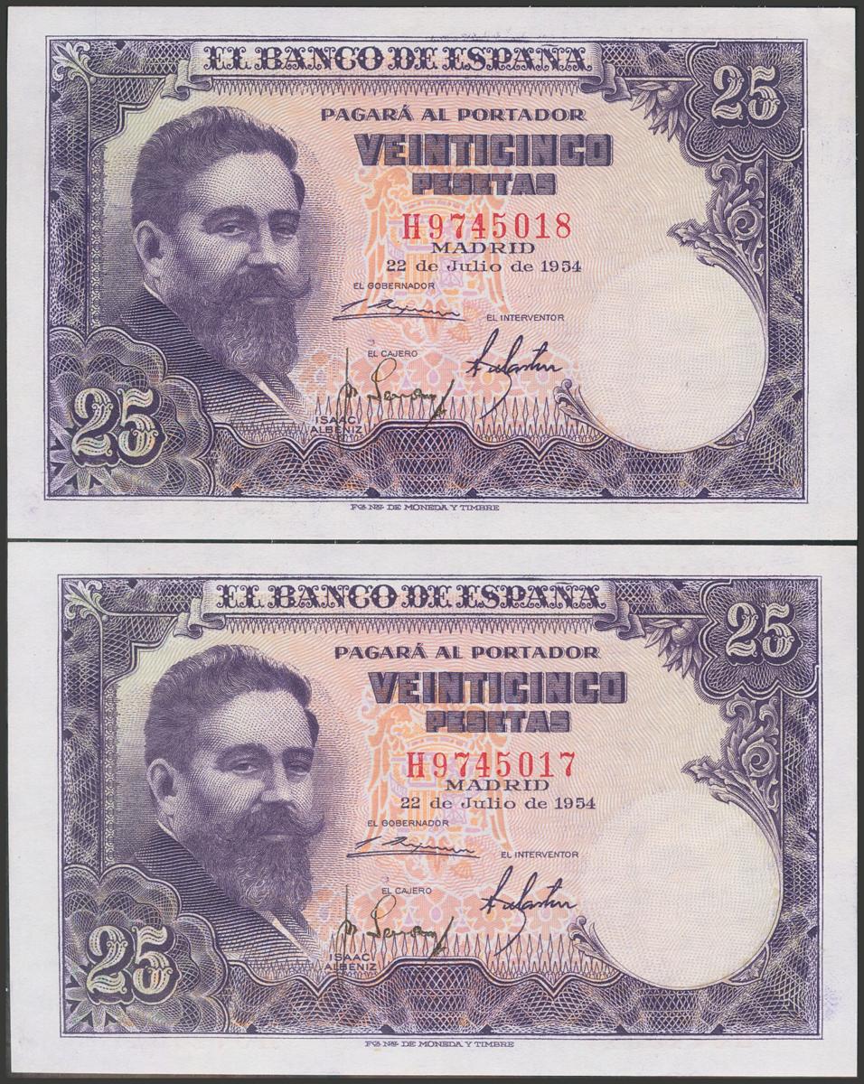 25 Pesetas. 22 de Julio de 1954. Pareja correlativa. Serie H. (Edifil 2017: 467a). Conserva todo su apresto original. EBC+.