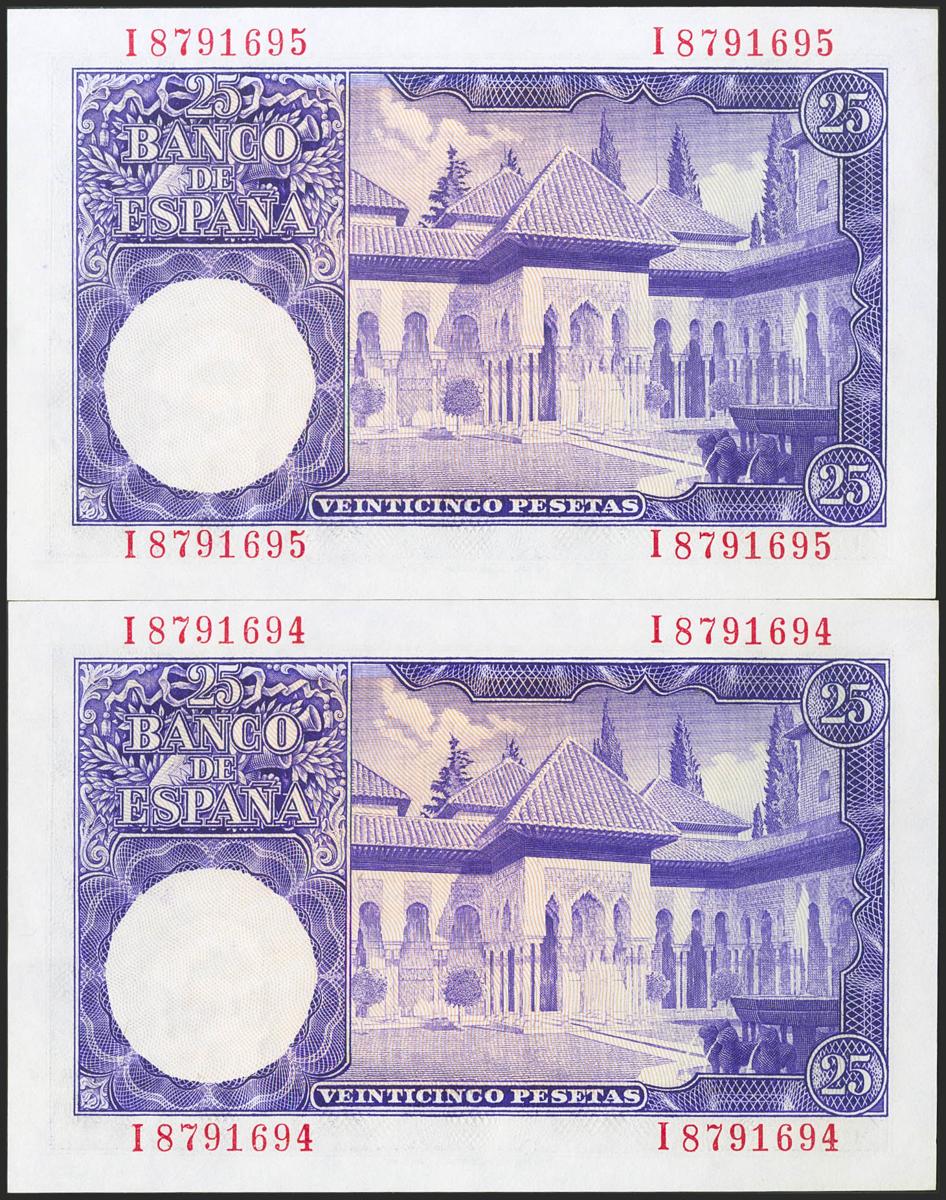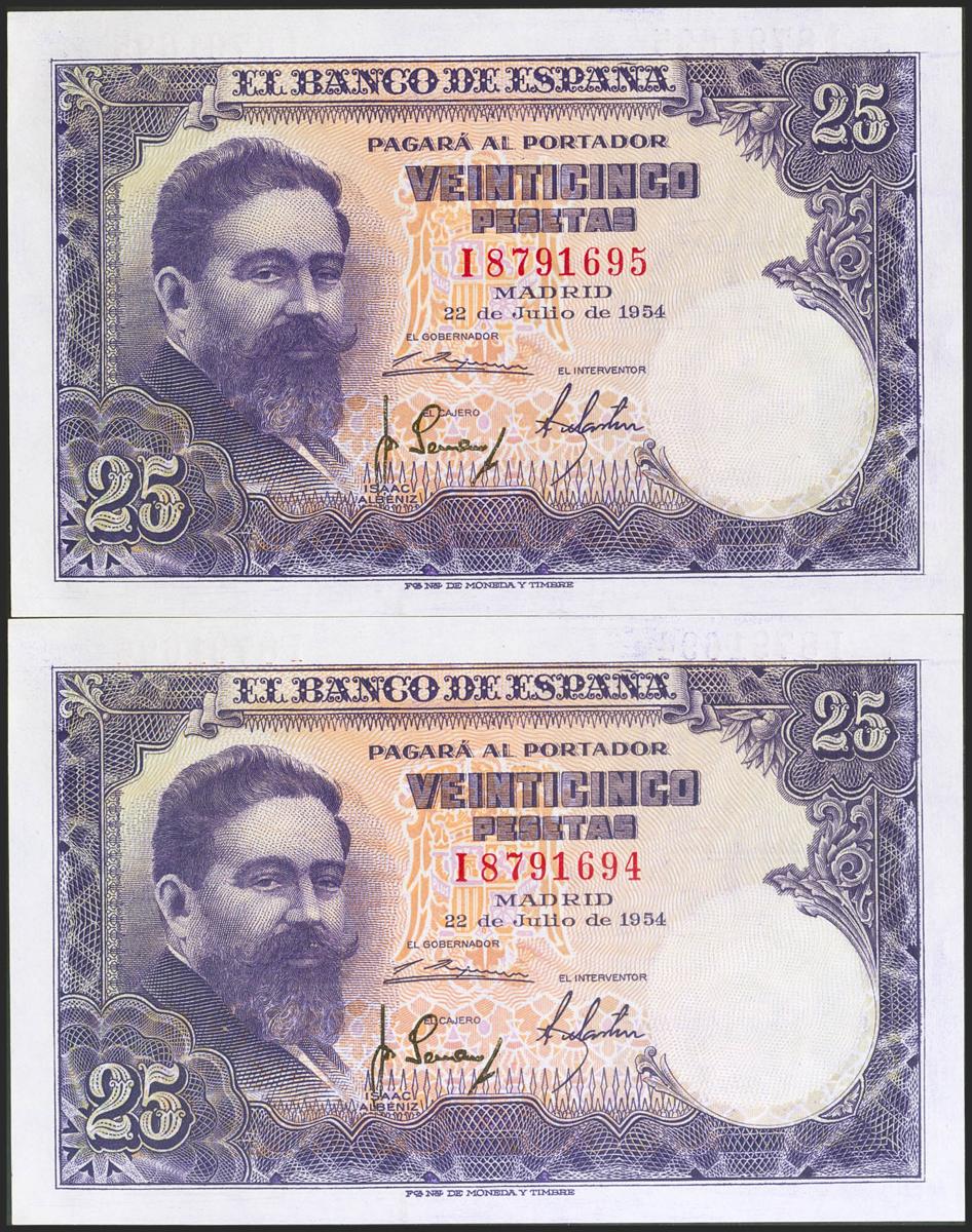 25 Pesetas. 22 de Julio de 1954. Pareja correlativa. Serie I. (Edifil 2021: 467a). Conserva todo su apresto original. SC.
