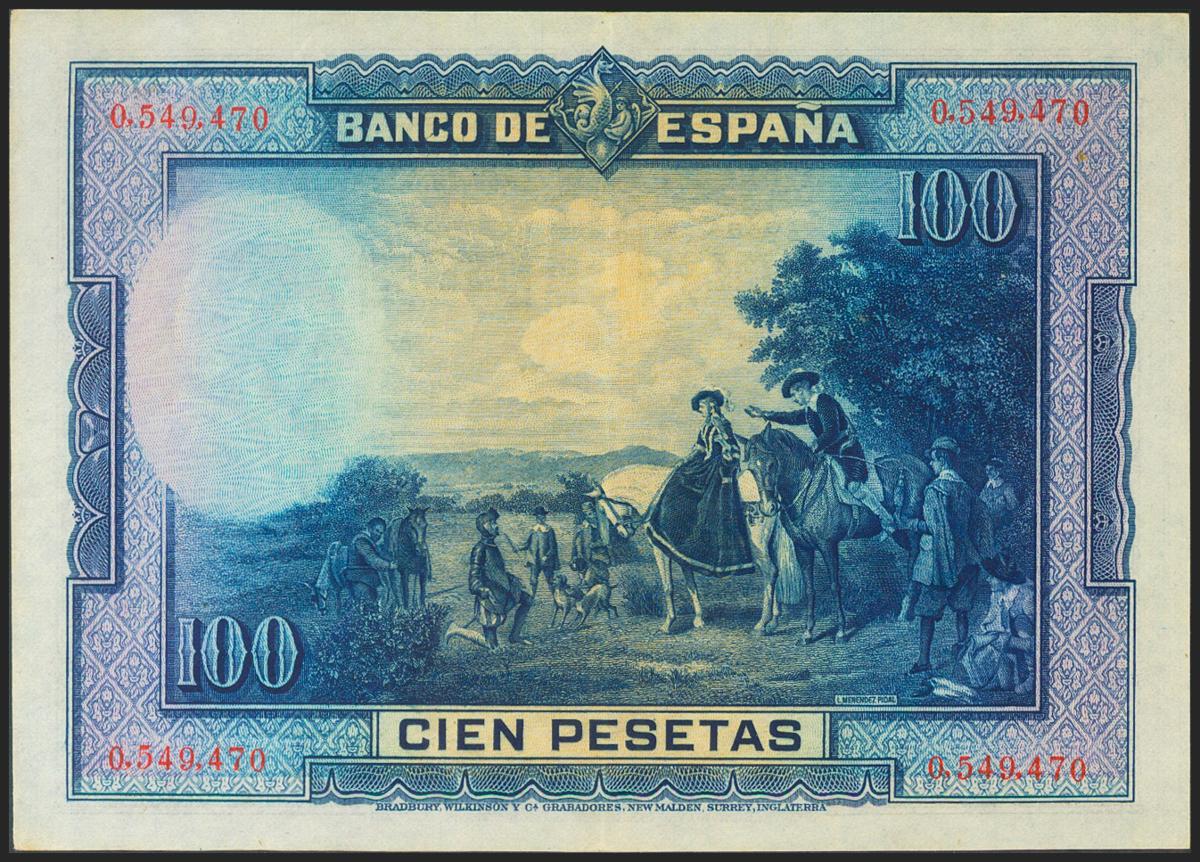 100 Pesetas. 15 de Agosto de 1928. Sin serie. (Edifil 2021: 355). Conserva parte del apresto original. EBC.