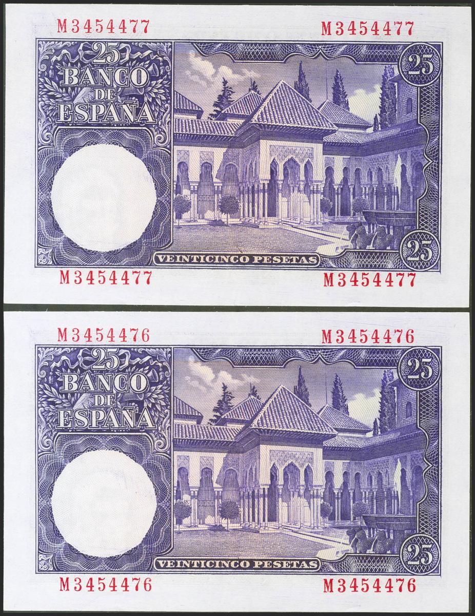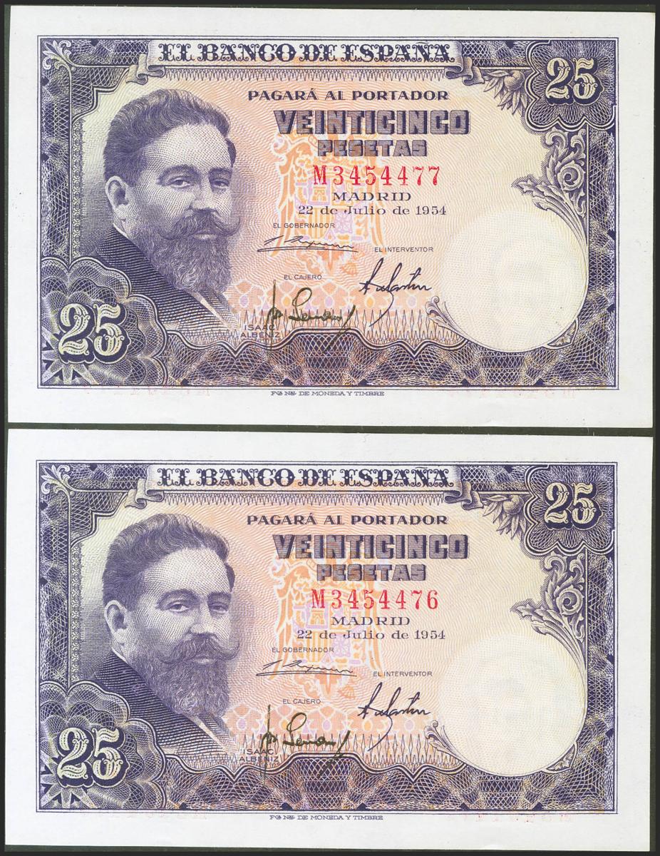25 Pesetas. 22 de Julio de 1954. Pareja correlativa. Serie M. (Edifil 2021: 467a). Conserva gran parte de su apresto original. EBC+.