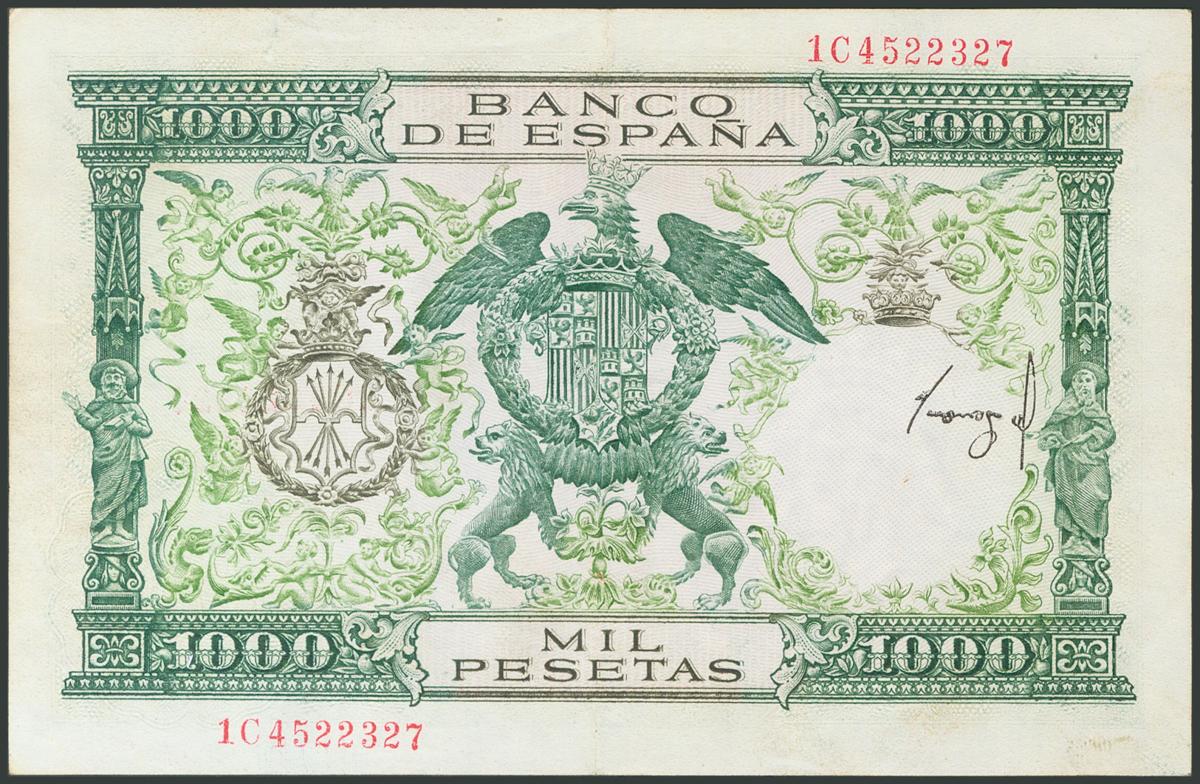 1000 Pesetas. 29 de Noviembre de 1957. Serie 1C. Error de impresión: firma del cajero en el reverso. (Edifil 2017: 469b, variedad no catalogada). Conserva parte del apresto original. EBC-.