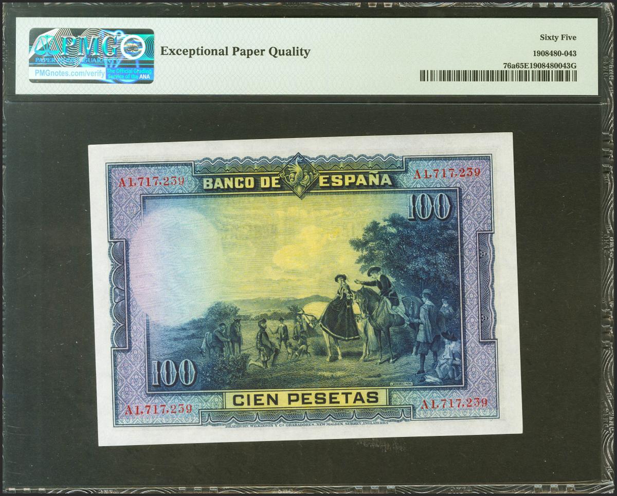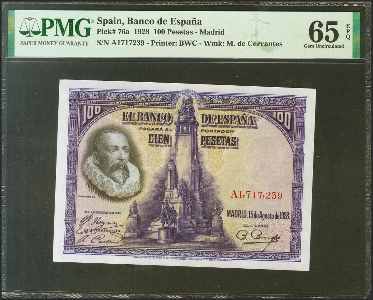 100 Pesetas. 15 de Agosto de 1928. Serie A. (Edifil 2021: 355, Pick: 76a). Apresto original. Encapsulado PMG65EPQ.