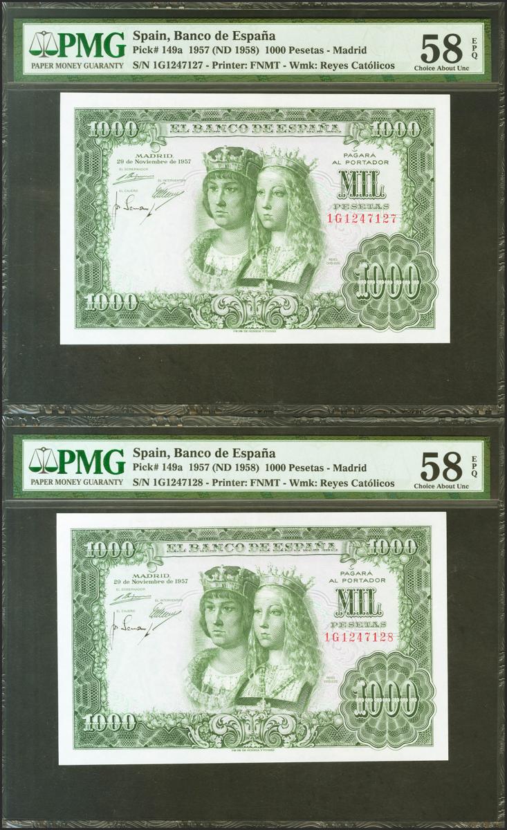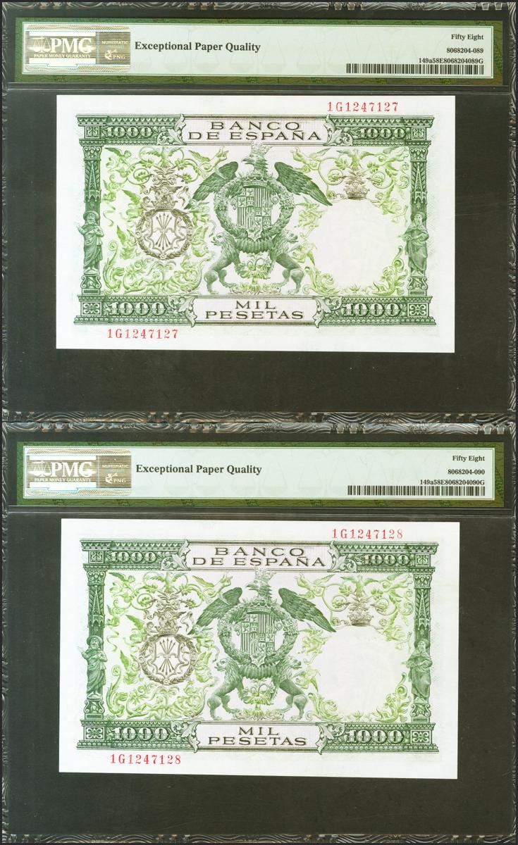 1000 Pesetas. 29 de Noviembre de 1957. Pareja correlativa. Serie 1G. (Edifil 2021: 469b, Pick: 149a). Apresto original. Encapsulados PMG58EPQ, ambos.